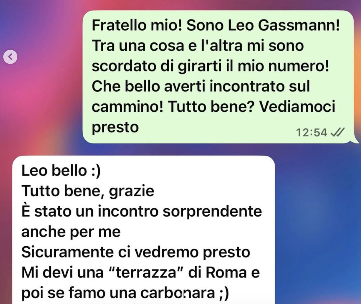 La loro amicizia a giudicare dalla conversazione WhatsApp pubblicata su Instagram dal cantante sarebbe nata nel settembre del 2023 dopo essersi beccati per puro caso, tant’è che è stato Leo a scrivere ad Aiello su WhatsApp dopo che quest’ultimo gli aveva lasciato il suo numero. “Fratello mio, sono Leo Gassmann. Tra una cosa e l’altra mi sono scordato di girarti il mio numero, che bello averti incontrato sul cammino! Tutto bene? Vediamoci presto“. Un messaggio a cui Aiello ha così risposto: “Leo bello 🙂 tutto bene, grazie, è stato un incontro sorprendente anche per me, sicuramente ci vedremo presto. Mi devi una “terrazza” di Roma e poi se famo una carbonara 😉“.