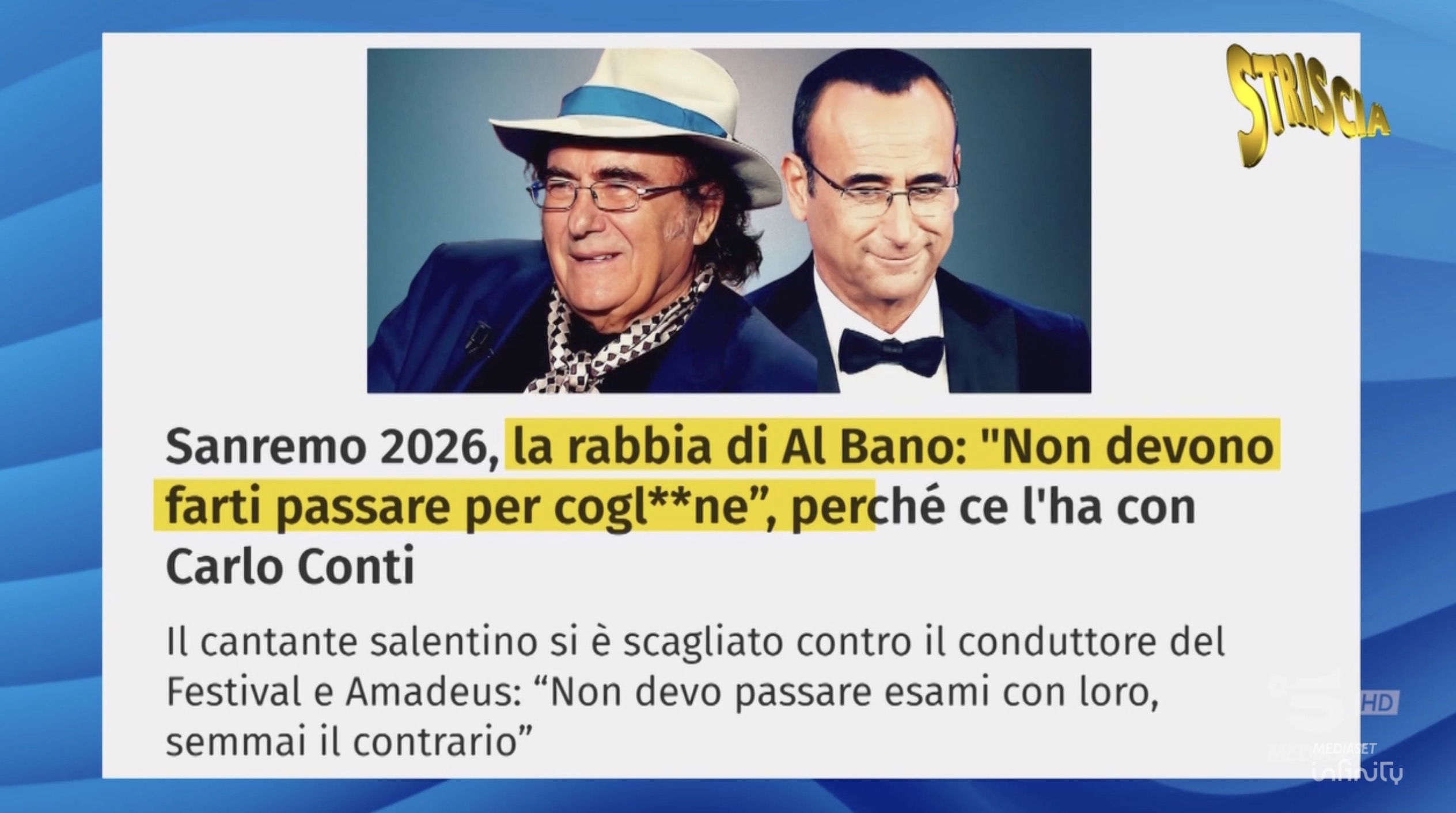 Guarda il video al link: https://t.co/szH101DWBE#Striscialanotizia #AlBano #CarloConti pic.twitter.com/0sB8StBIBL— Striscia la notizia (@Striscia) February 12, 2026