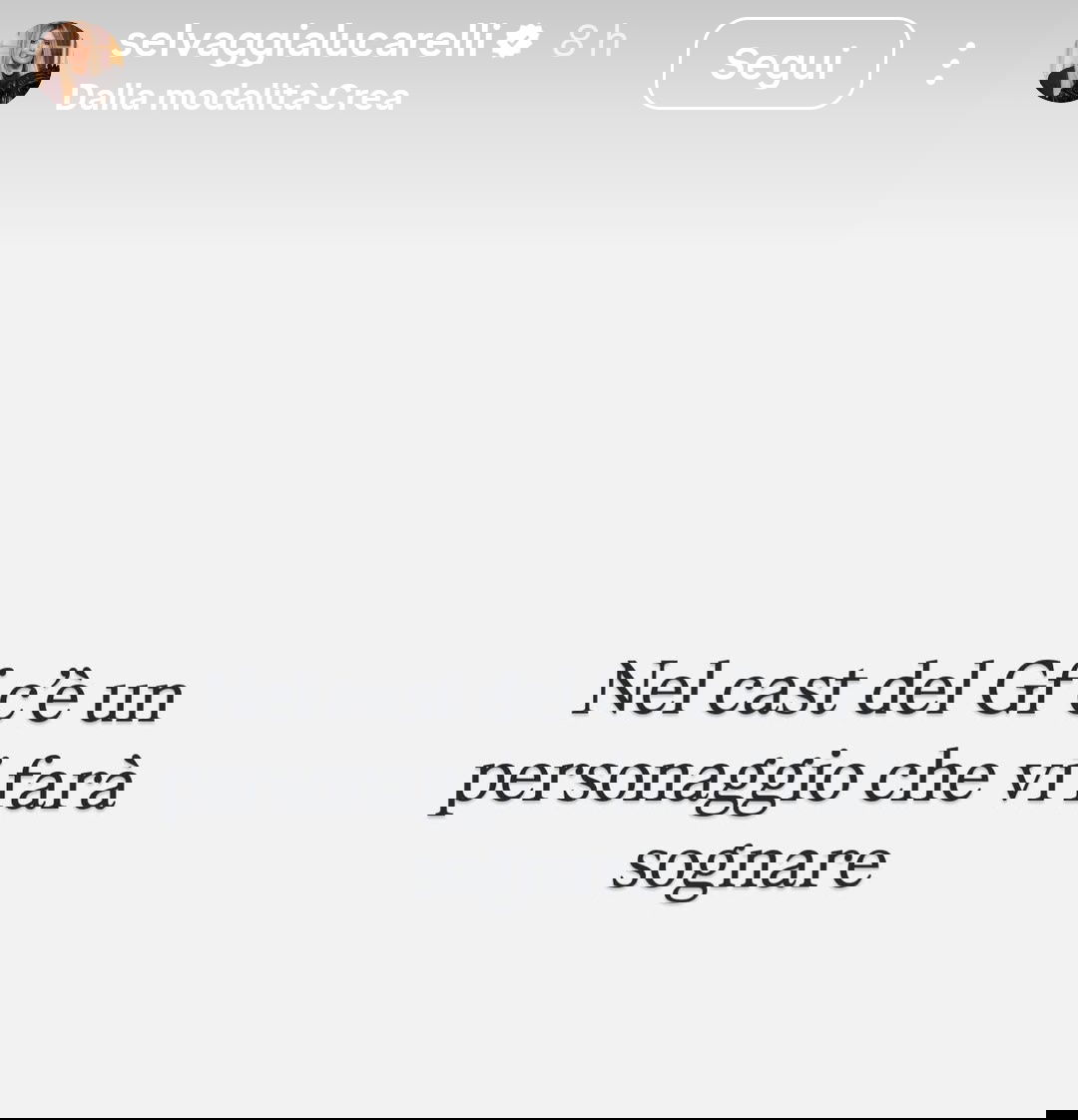 Ad Alessandra Mussolini, Adriana Volpe, Antonella Elia, Paola Caruso, Francesca Manzini e Barbara Prezia si aggiunge anche Marco Berry e “un personaggio che ci farà sognare”, queste le parole di Selvaggia Lucarelli che su Instagram, con questa storia, ha involontariamente confermato la sua presenza come opinionista di Ilary Blasi.