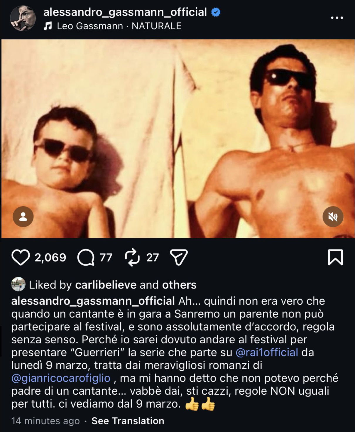 “Ah… quindi non era vero che quando un cantante è in gara a Sanremo un parente non può partecipare al festival, e sono assolutamente d’accordo, regola senza senso” – ha scritto – “Perché io sarei dovuto andare al festival per presentare Guerrieri la serie che parte su Rai1 da lunedì 9 marzo, tratta dai meravigliosi romanzi di Gianrico Carofiglio, ma mi hanno detto che non potevo perché padre di un cantante… vabbè dai, sti cavoli, regole NON uguali per tutti. Ci vediamo dal 9 marzo“.