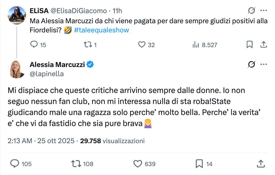 Qualcuno su X ha così scritto: “Ma Alessia Marcuzzi da chi viene pagata per dare sempre giudizi positivi alla Fiordelisi?”. Un post che Alessia ha notato e a cui ha risposto. “Mi dispiace che queste critiche arrivino sempre dalle donne. Io non seguo nessun fan club, non mi interessa nulla di sta roba! State giudicando male una ragazza solo perché molto bella. Perché la verità è che vi da fastidio che sia pure brava“. E a un’altra utente (che però ha rimosso il suo commento) Alessia Marcuzzi ha risposto: “Critiche dalle donne, per le donne. Guarda il caso. Nicola e Giorgio che hanno detto bravissima come me, neanche li nomini“.