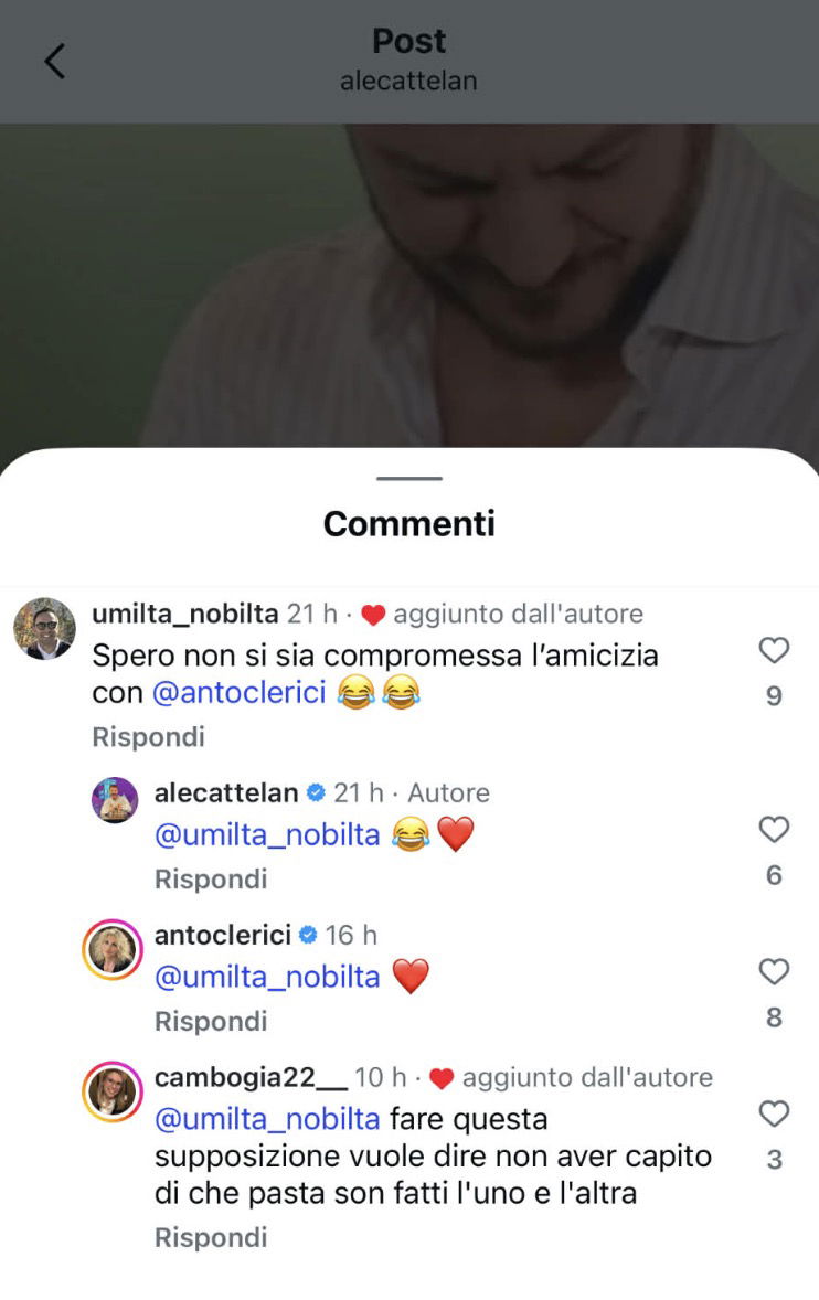 Antonella Clerici ha risposto ad Alessandro Cattelan dopo che lui, in modo ironico, aveva reagito a una sua frecciatina sul “doversi sporcare di sugo”. La conduttrice lo ha fatto mettendo un cuore rosso a un commento di un utente, proprio sotto il video di Cattelan, in cui si leggeva: “Spero non si sia compromessa l’amicizia con Antonella Clerici”.