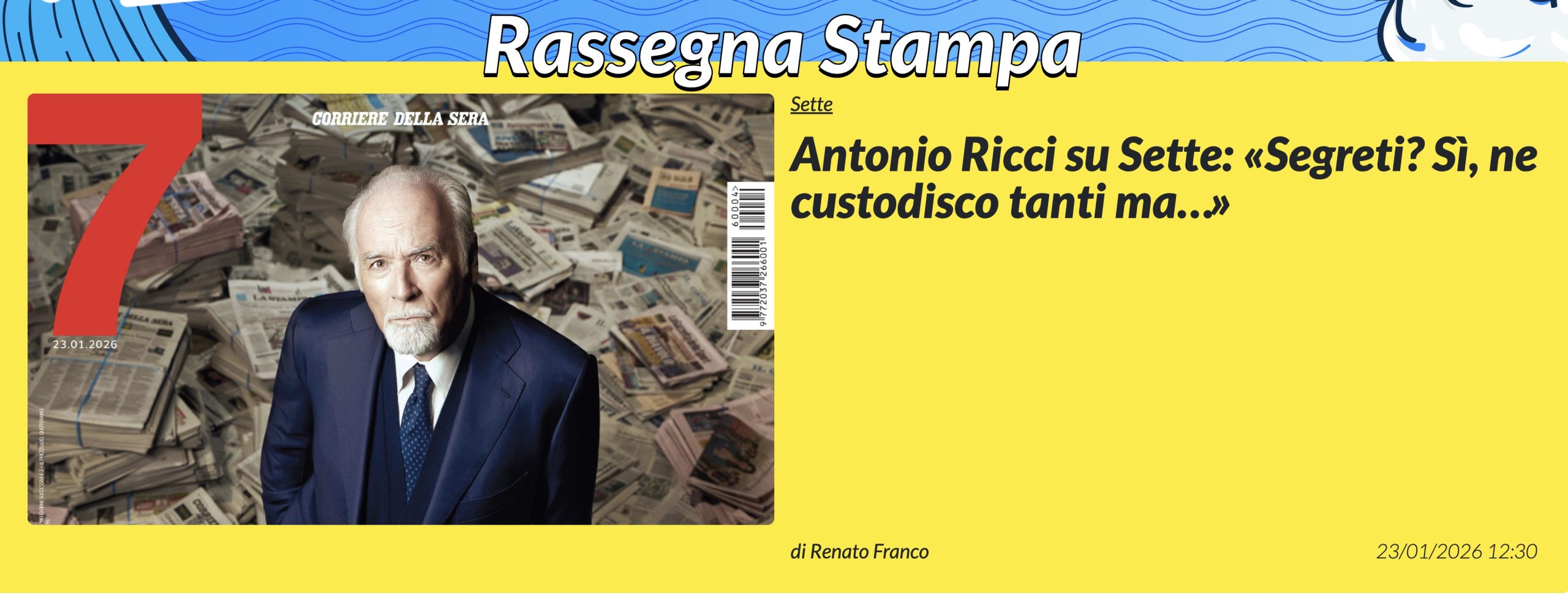 Durante la conferenza stampa di Striscia la Notizia, Antonio Ricci ha risposto ai giornalisti che gli hanno chiesto del caso di Fabrizio Corona e Alfonso Signorini e ha spiegato che prima di accusare qualcuno e parlare di un “sistema” bisogna avere molte prove e che quindi al momento è bene procedere con cautela. Il padre di Striscia è tornato a parlare di Signorini in un’intervista rilasciata a 7, il magazine del Corriere della Sera, rispondendo a una domanda sull’affidabilità di Alfonso e quella di Fabrizio: “Chi è più affidabile tra Signorini e Corona? Io penso che se organizzassero una gara ne uscirebbe un evento a livello mondiale, con scommesse clamorose. La certezza che avrei è che comunque il risultato sarebbe falsato. In entrambi i casi si gioca falso“.