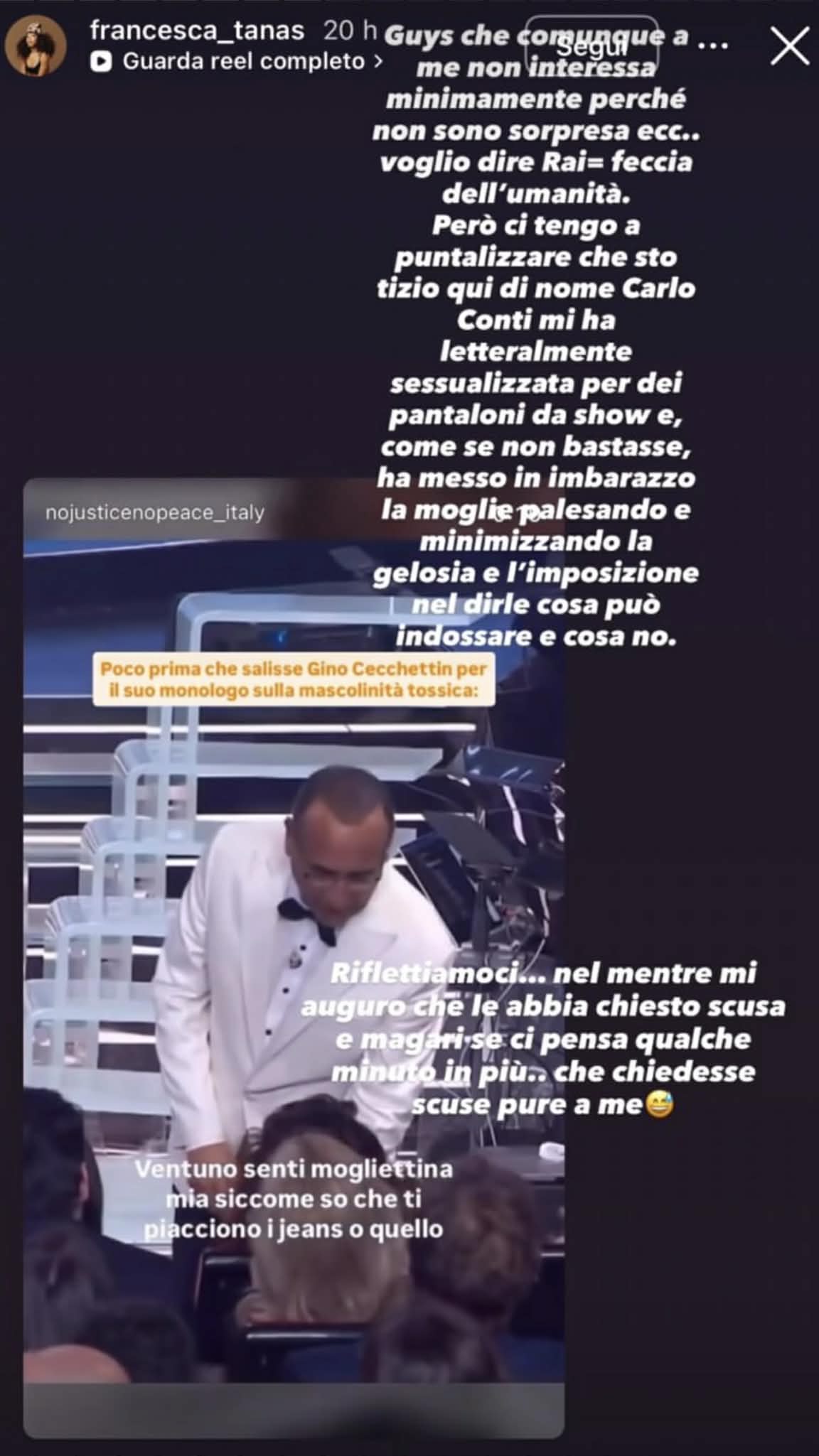 La ballerina in questione, Francesca Tanas, si è riconosciuta nella foto pubblicata da Carlo Conti su Instagram e gli ha risposto per le rime accusandolo di averla sessualizzata esclusivamente per un outfit lavorativo. “Guys, che comunque a me non interessa minimamente perché non sono sorpresa, voglio dire Rai = feccia dell’umanità. Però ci tengo a puntualizzare che sto tizio qua di nome Carlo Conti mi ha letteralmente sessualizzata per dei pantaloni da show e come se non bastasse ha messo in imbarazzo la moglie palesando e minimizzando la gelosia e l’imposizione nel dirle cosa può indossa e cosa no. Riflettiamoci. Nel mentre mi auguro che le abbia chiesto scusa e magari se ci pensa qualche minuto in più che chiedesse scusa pure a me“.