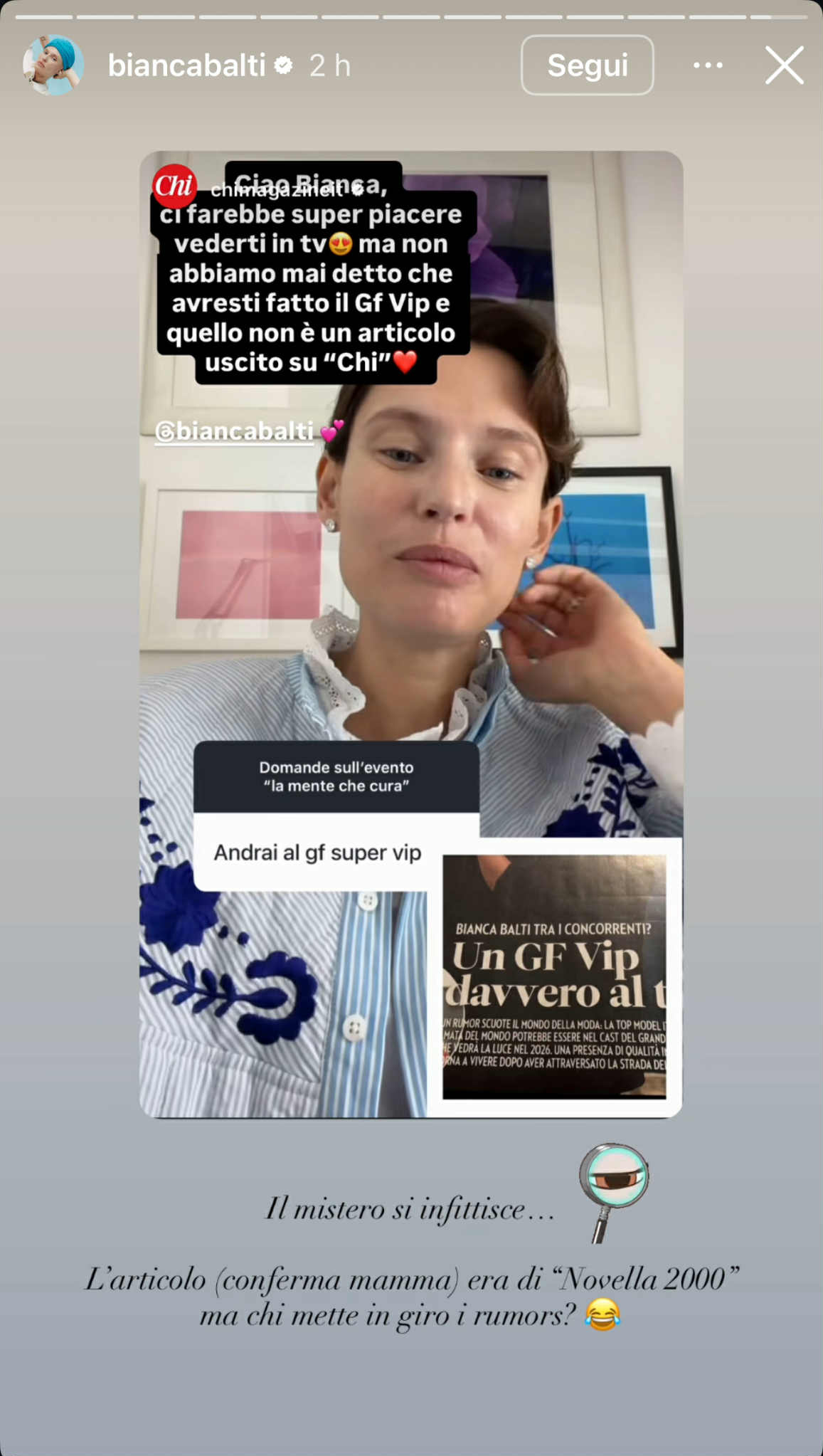 Il video è diventato virale e Alfonso Signorini ha fatto rispondere tramite profilo Instagram del settimanale Chi. “Ciao Bianca, ci farebbe super piacere vederti in tv. Ma non abbiamo mai detto che avresti fatto il GFVip e quello non è un articolo uscito su Chi“. “Il mistero si infittisce” – ha risposto Bianca Balti – “L’articolo (conferma mamma) era di Novella 2000, ma chi mette in giro i rumors?“.