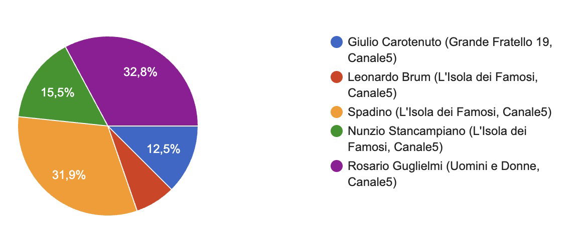 Sugli uomini avete le idee chiare perché Omer Elomari ha vinto sia il PREMIO WOW CHE CALDO (seguito da Flavio Ubirti e Rosario Guglielmi) sia il PREMIO AFFARI TUOI (seguito da Spadino e da Stefano De Martino. Il PREMIO ENTRO SPACCO ESCO CIAO è stato invece vinto da Rosario Guglielmi per il suo non-trono a Uomini & Donne, seguito da Spadino e poi da Nunzio Stancampiano per il ritiro da L’Isola dei Famosi.