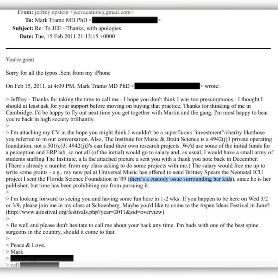 Il nome di Britney Spears negli Epstein Files compare solo una volta ma nonostante questo su TikTok sono partite varie teorie complottistiche al riguardo. La cantante in questo caso non è né una vittima né una colpevole, ma semplicemente una persona famosa citata in una email da un medico. L’email risale addirittura al 2011 ed è stata scritta da un medico e inviata a Jeffrey Epstein in cui gli parla della possibilità di proporre alla cantante un progetto di beneficenza neonatale, aggiungendo però che la cosa non era proseguita a causa dei problemi personali legati a lei.