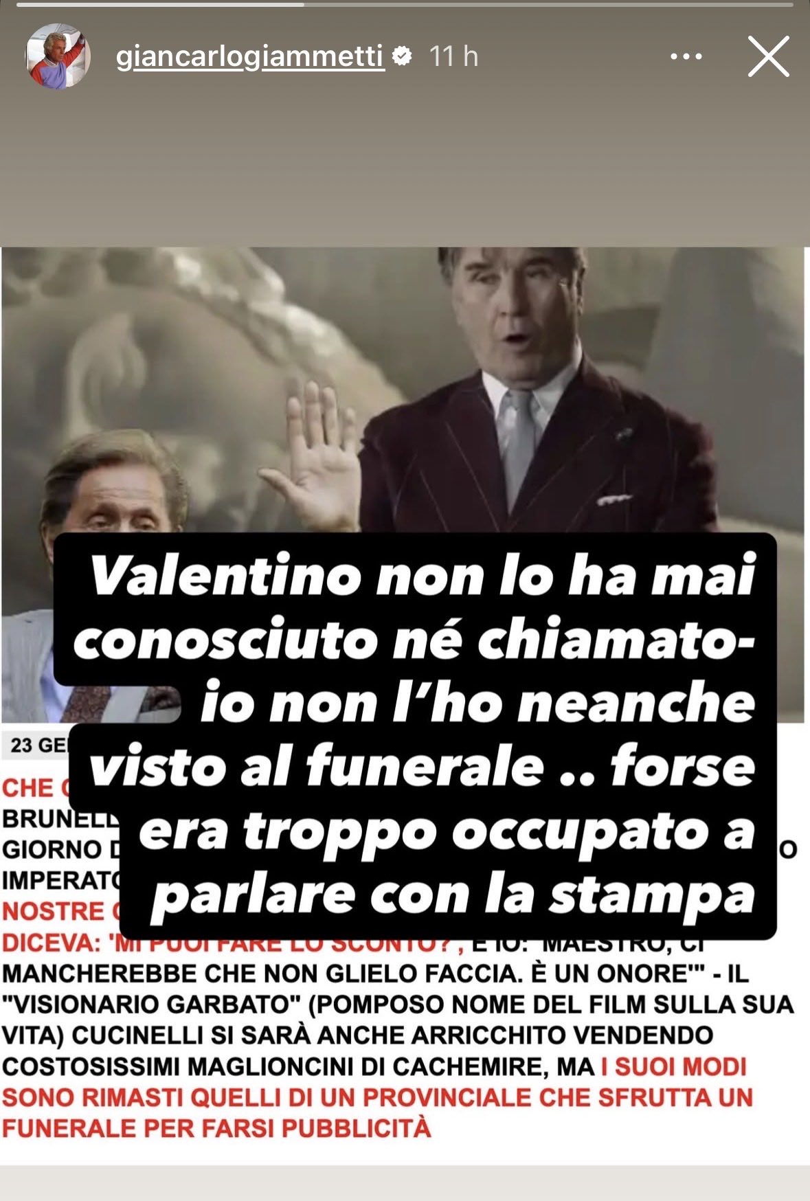 Queste parole non hanno però trovato conferma in Giancarlo Giammetti che, riprendendo un articolo di Dagospia, ha sbottato su Instagram: “Valentino non lo ha mai conosciuto né chiamato, io non l’ho neanche visto al funerale. Forse era troppo occupato a parlare con la stampa“.