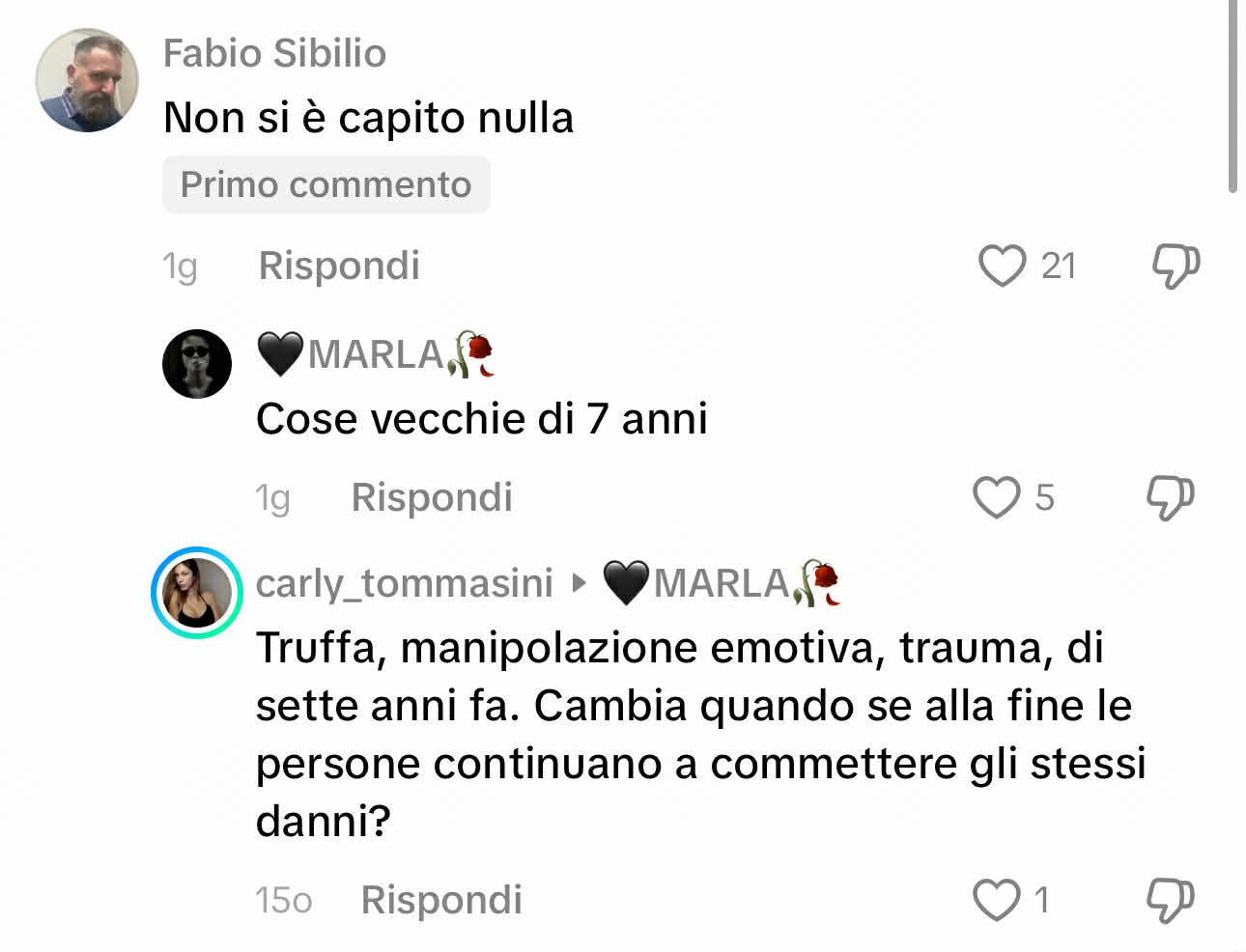 Cara Villain, nelle ultime settimane, è finita al centro di alcune dinamiche malsane con parte della comunità transgender italiana e il suo video intitolato “sono stata denigrata da altre trans” è diventato virale su TikTok. La situazione si è ulteriormente aggravata quando Carly Tommasini, dopo aver precisato di non avere assolutamente nulla a che fare con quelle offese, ha riportato alla luce un episodio risalente a sette anni fa che non depone certo a suo favore. “Truffa, manipolazione emotiva, trauma“, ha scritto nei commenti.
