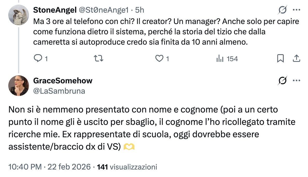 E ancora: “Cotanta movimentazione non l’ho vista mai (e son anni che scrivo, intervisto, critico). Neanche un modo di fare così intimidatorio – se non cancelli il pezzo, ci va di mezzo 21enne. Tutto ciò mi ribadisce che non sia oro ciò che luccica. Dunque non mi fermo. Non amo i prepotenti“. In risposta a un utente, Grazia Sambruna ha poi aggiunto: “Non si è nemmeno presentato con nome e cognome (poi a un certo punto il nome gli è uscito per sbaglio, il cognome l’ho ricollegato tramite ricerche mie. Ex rappresentate di scuola, oggi dovrebbe essere assistente/braccio destro di Vincenzo Schettini)“.