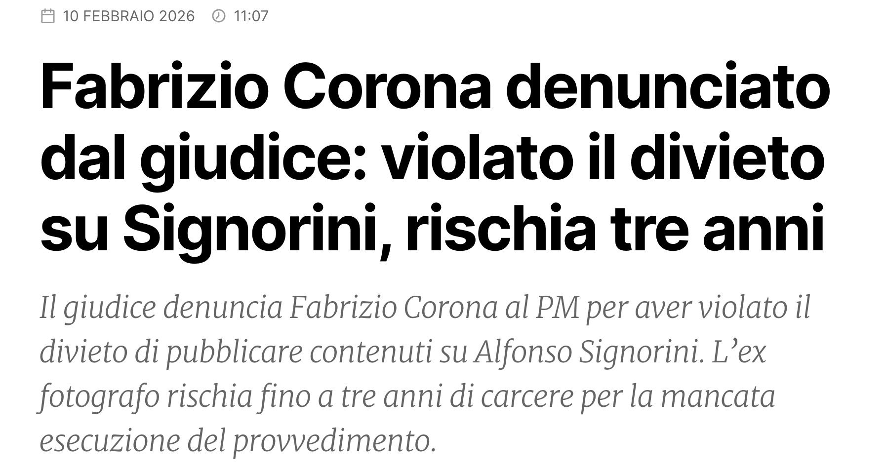 Lunedì 26 gennaio il giudice Roberto Pertile a fronte di un ricorso presentato dagli avvocati di Alfonso Signorini, ha disposto il blocco della terza puntata di Falsissimo il Prezzo del Successo e la cancellazione delle prime due e dei relativi contenuti diffusi da Fabrizio Corona su tutte le piattaforme social. L’ex re dei paparazzi ha avviato la narrativa della “censura”, ma in realtà lo strumento dell’inibitoria alla pubblicazione (che era stato ampiamente spiegato dal noto avvocato Fabrizio Ravidà prima delle disposizioni del giudice) è uno strumento di tutela preventiva comune in casi come questo. Il legale Ivano Chiesa ha spiegato che il suo assistito si sarebbe adeguato alla decisione del giudice e all’inizio così è sembrato, sabato 7 febbraio però – dopo un nuovo ricorso degli avvocati di Signorini – il giudice Roberto Pertile ha detto che Fabrizio Corona “deve essere sin d’ora denunciato al Pubblico Ministero per mancata esecuzione dolosa di un provvedimento del giudice“.