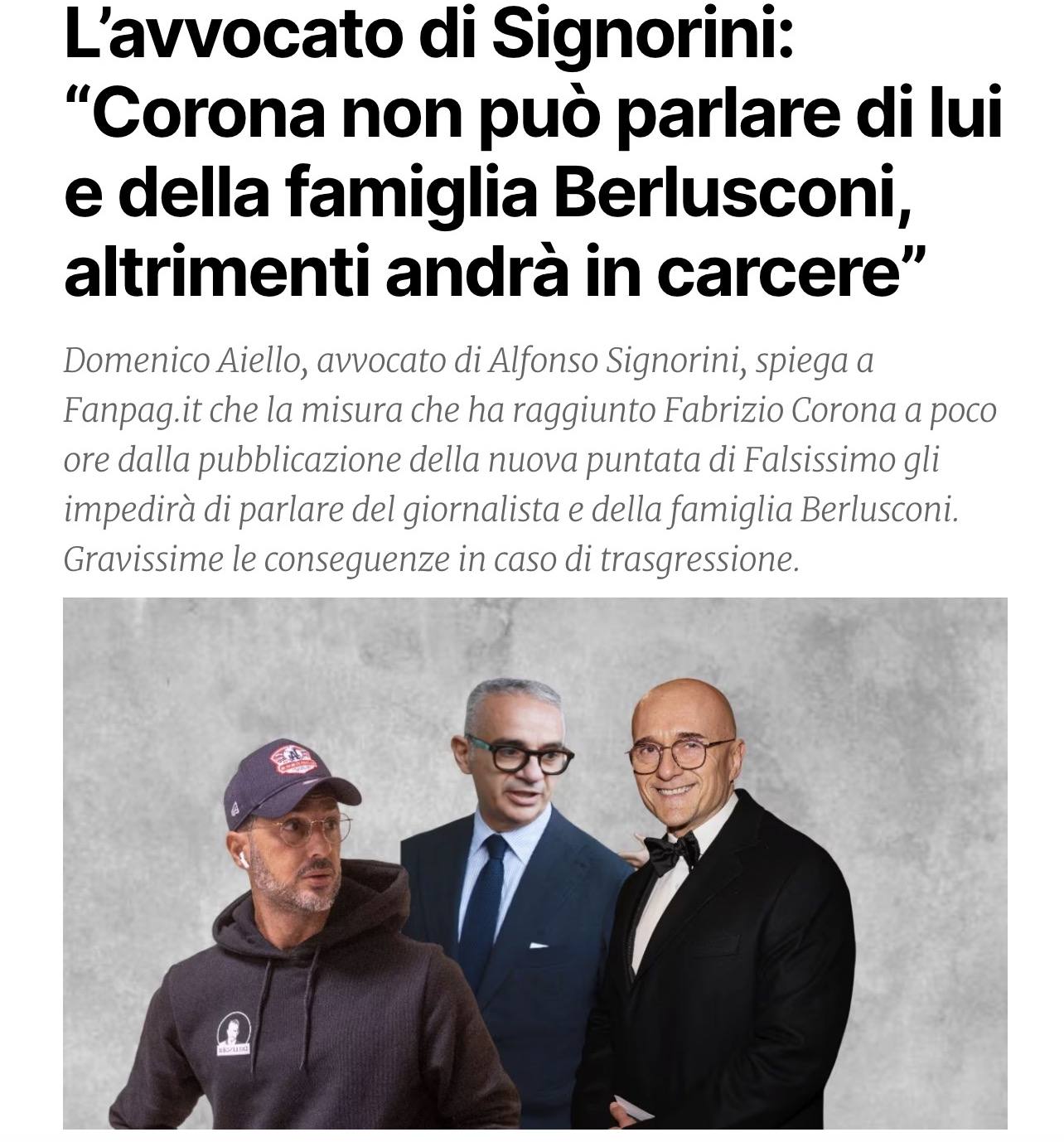 Il giudice Roberto Gentile ha disposto la rimozione di tutti i contenuti che Fabrizio Corona ha condiviso su ogni canale in relazione al caso Signorini, ma ha anche bloccato la pubblicazione della nuova puntata di Falsissimo e ha vietato all’ex re dei paparazzi qualsiasi diffusione di contenuti diffamatori o che “possano danneggiare direttamente o indirettamente, il diritto di Alfonso alla reputazione, all’immagine e alla riservatezza”.
