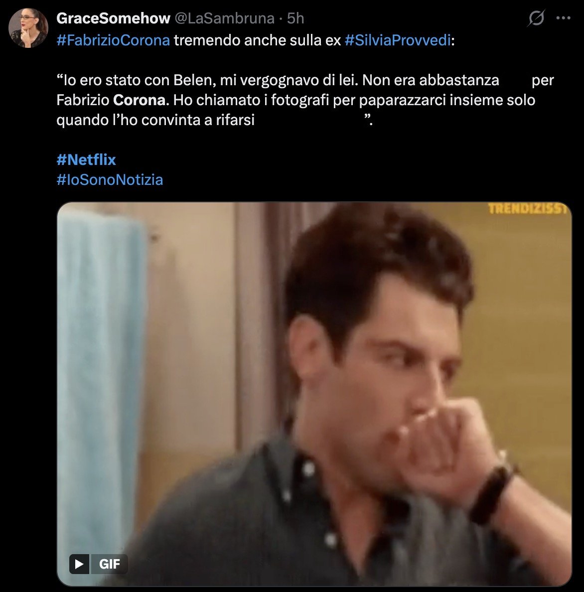 Nel quinto episodio della sua serie su Netflix, Corona ha dichiarato di essersi vergognato di uscire con Silvia Provvedi nella seconda parte della loro storia, perché lui era “abituato alle donne del momento”, come lo era stata Belen Rodriguez. Proprio perché non considerava la cantante alla sua altezza, Fabrizio ha detto di averla plasmata e di averle anche rifatto il look, come se parlasse di una Barbie.