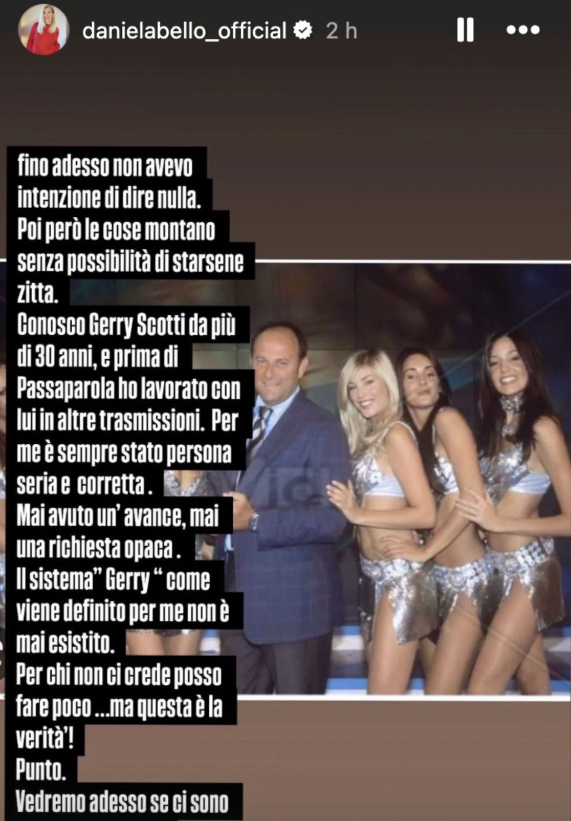 L’ex letterina infatti, in una storia pubblicata su Instagram, ha assicurato di non aver mai ricevuto avance da parte di Gerry Scotti, nemmeno strane proposte, il conduttore con lei è sempre stato educato e professionale: “Fino ad adesso non avevo intenzione di dire nulla. Poi però le cose montano senza possibilità di restare zitta. Conosco Gerry Scotti da più di 30 anni e, prima di Passaparola, ho lavorato con lui in altre trasmissioni. Per me è sempre stata una persona seria e corretta. Mai avuto avance, mai una richiesta opaca. Il ‘sistema Gerry’ come viene definito, per me non è mai esistito. Per chi non ci crede posso fare poco, ma questa è la verità. Punto. Vedremo adesso se ci sono vie legali per agire“.