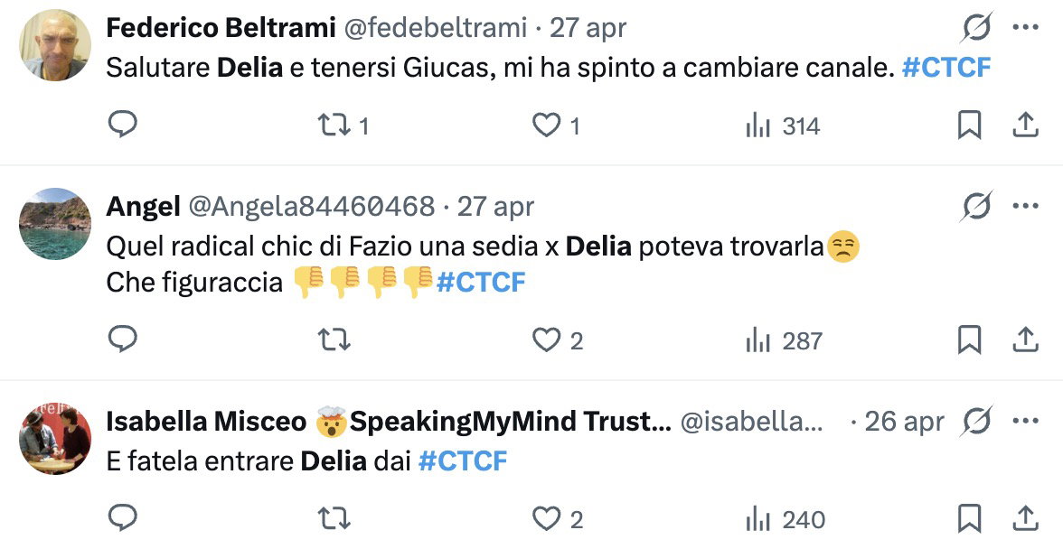 Domenica sera Serena Brancale, Levante e Delia sono state ospiti da Fabio Fazio a Che Tempo Che Fa per la consueta promozione del loro singolo Al Mio Paese. Tuttavia, dopo l’esibizione, quando il conduttore si è spostato al Tavolo, ha salutato Delia facendo rimanere sedute solo Serena e Levante. Una scelta che non è piaciuta al popolo di X. “Salutare Delia e tenersi Giucas mi ha spinto a cambiare canale“, si è letto. E ancora: “Quel radical chic di Fazio una sedia per Delia poteva trovarla, che figuraccia“. “E fatela entrare Delia, dai“. “Peccato aver liquidato così Delia Buglisi, grandissima voce professionista. Solo perché Levante e Brancale sono più note al pubblico“.