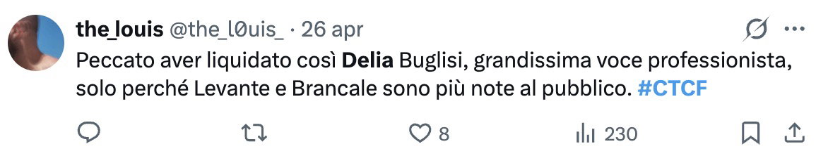 “Ieri sera non è andato in onda solo un programma televisivo. È andato in scena un meccanismo che conosciamo tutti, ma che fingiamo di non vedere. Tre artiste invitate. Una canzone, lo stesso palco, la stessa visibilità. Poi succede qualcosa. Quando si passa al “tavolo che conta”, quello dove si resta, si commenta, si esiste davvero, una, Delia, viene saluta e mandata via. Saluti, grazie, arrivederci. Le altre restano. Non per talento. Non per merito. Ma per nome.