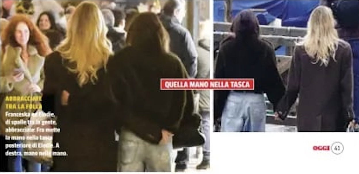 Nel corso dell’ultimo mese il settimanale Diva & Donna le ha fotografate in un quasi bacio scrivendo nero su bianco che, per amore di Franceska, Elodie avrebbe lasciato Andrea Iannone. Il settimanale Chi, invece, le ha immortalate mano nella mano durante una sessione di shopping, sostenendo di aver saputo che le due sarebbero andate a vivere insieme. Questa settimana, invece, il settimanale Oggi ha raccontato la loro gita romantica a Venezia, dove sono state viste a braccetto e con le mani nelle tasche dei jeans l’una dell’altra. “Quanto è dolce Venezia per Elodie e Franceska“, recita il titolo del servizio. “Alla vigilia di San Valentino, Elodie è andata con la sua nuova ragazza in Laguna. Eccole con gli occhi negli occhi e le mani intrecciate, passeggiando insieme per le calli“.