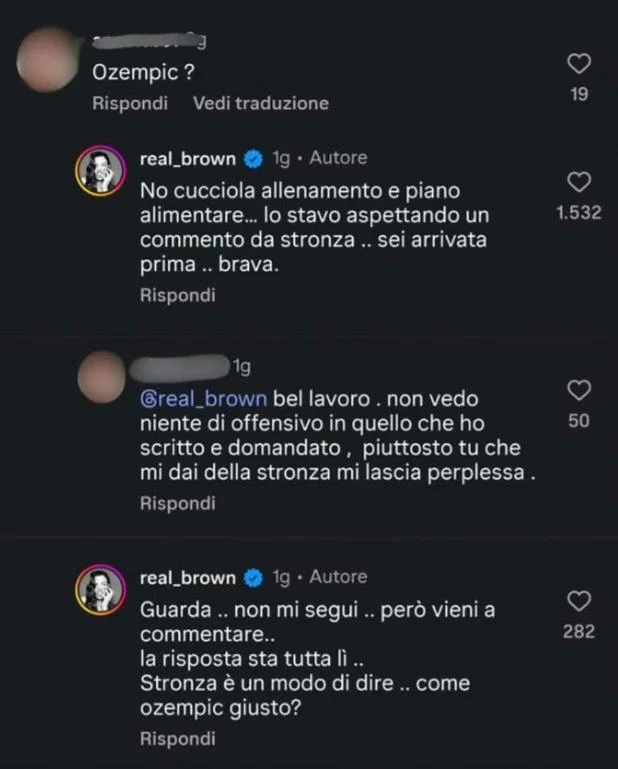 Lo ha confessato lei stessa in risposta a un follower che le aveva chiesto se avesse usato il farmaco Ozempic per perdere tutto quel peso. “No cucciola allenamento e piano alimentare. Lo stavo aspettando un commento da S, sei arrivata prima, brava!” – e ancora – “Guarda, non mi segui però vieni a commentare, la risposta sta tutta lì! S è un modo di dire come Ozempic giusto?“.