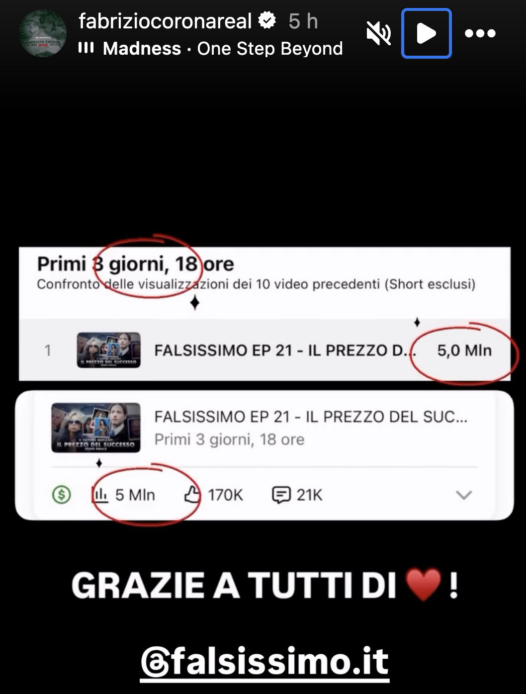 Le prime due puntate di Falsissimo Il Prezzo del Successo sono state rimosse da YouTube , così come è stato cancellato ogni contenuto riferito ad esse sui social di Fabrizio Corona, dopo un ricorso d’urgenza presentato da Alfonso Signorini. Il Tribunale di Milano lunedì scorso attraverso un’inibitoria alla pubblicazione ha impedito che l’ex re dei paparazzi affrontasse nuovamente il caso Signorini in un terzo capitolo de Il Prezzo del Successo. Corona però lo scorso 26 gennaio ha pubblicato un nuovo episodio di Falsissimo, dedicato però a Mediaset, a Pier Silvio Berlusconi e a diversi volti noti del Biscione, il video in appena 4 giorni è arrivato all’enorme cifra di 5 milioni di visualizzazioni, tanto che Fabrizio ha festeggiato questo traguardo, non sapendo che poche ore dopo sarebbe arrivata un’altra batosta per lui e per il suo format.