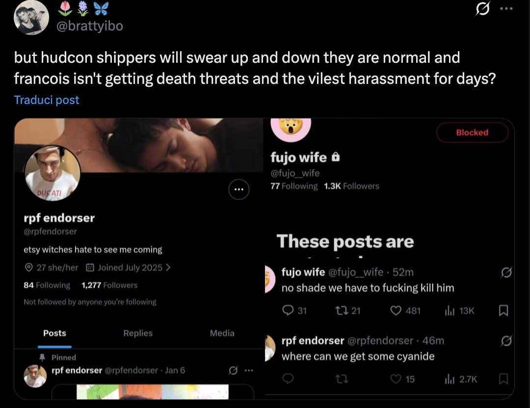 Pochi giorni dopo l’uscita dei primi episodi di Heated Rivalry in USA e Canada, alcuni fan hanno visto Connor Storrie e François Arnaud mentre uscivano insieme da un cinema e da quel momento sono nati i rumor di una storia segreta tra i due. Il protagonista della serie canadese e il collega sono apparsi insieme anche in tante altre occasioni, feste, eventi, tour promozionali e in aeroporto a New York e questo non ha fatto altro che alimentare ancora di più le voci di una relazione. I gossip però si sono trasformati in qualcosa di molto più inquietante, perché molti fan avrebbero voluto che Connor anche nella vita reale si fosse innamorato di Hudson Williams (suo partner del telefilm) e per questo hanno iniziato a perseguitare, offendere e minacciare François Arnaud, che adesso ha deciso di rompere il silenzio.