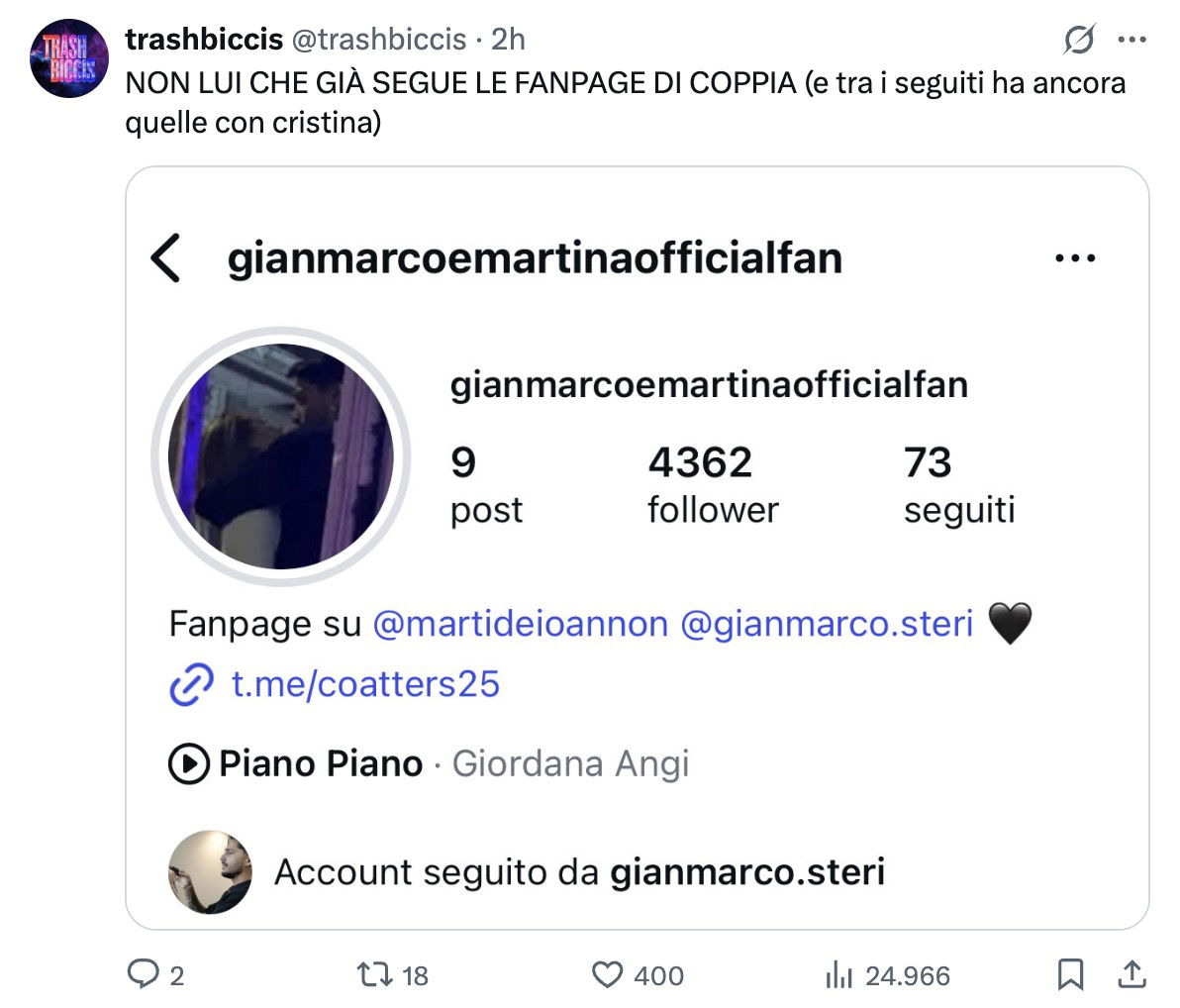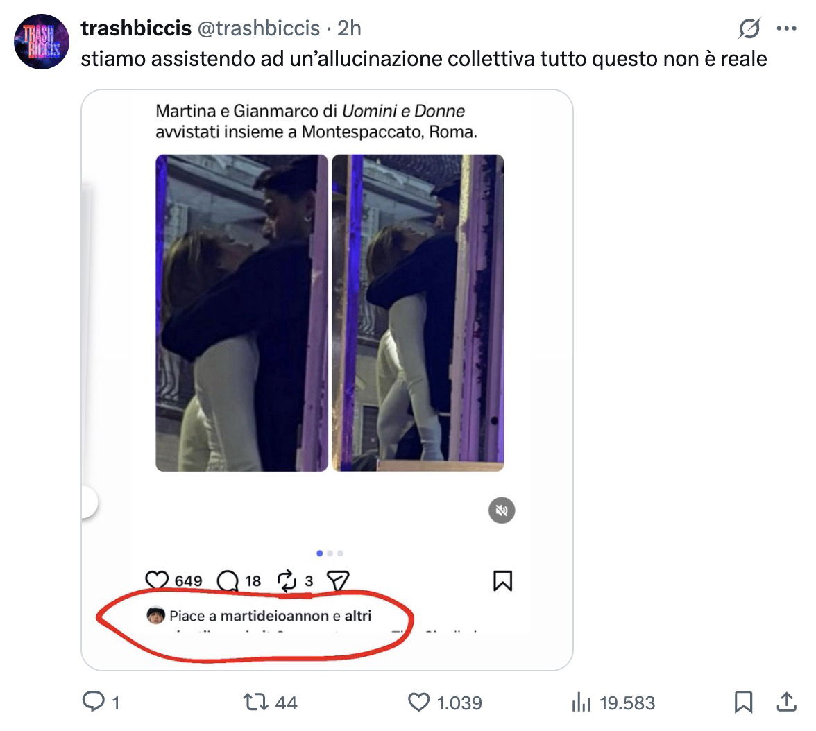 Nel dubbio, Martina e Gianmarco ora non si nascondono più e hanno confermato a modo loro di stare insieme: lei ha messo mi piace a una loro foto, mentre lui ha iniziato a seguire una fanpage di coppia.