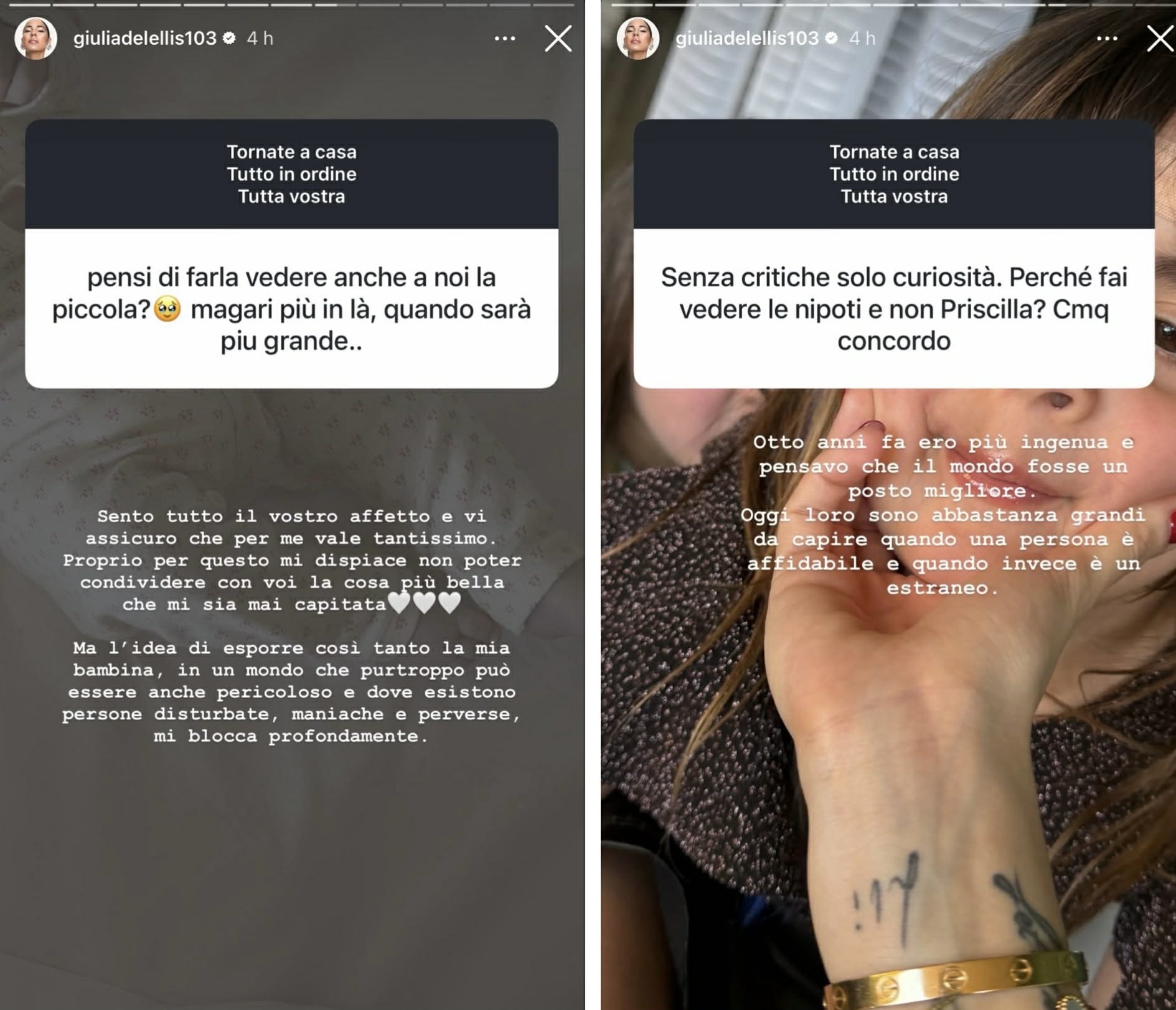 Qualche giorno fa, su Instagram ha svelato perché non ha ancora mostrato il volto della figlia che viene ritratta sempre con oggetti/mani sul viso o in angolazioni dove non si vede il volto. “Mi dispiace non poter condividere con voi la cosa più bella che mi sia mai capitata, ma l’idea di esporre così tanto la mia bambina, in un mondo che purtroppo può essere anche pericoloso e dove esistono persone disturbate, maniache e perverse, mi blocca profondamente“. E quando qualcuno, dopo aver letto questa sua risposta, le ha ricordato che le sue nipoti le pubblica da anni e continua a pubblicarle, ha risposto: “Otto anni fa ero più ingenua e pensavo che il mondo fosse un posto migliore. Oggi loro sono abbastanza grandi da capire quando una persona è affidabile e quando invece è un estraneo“.