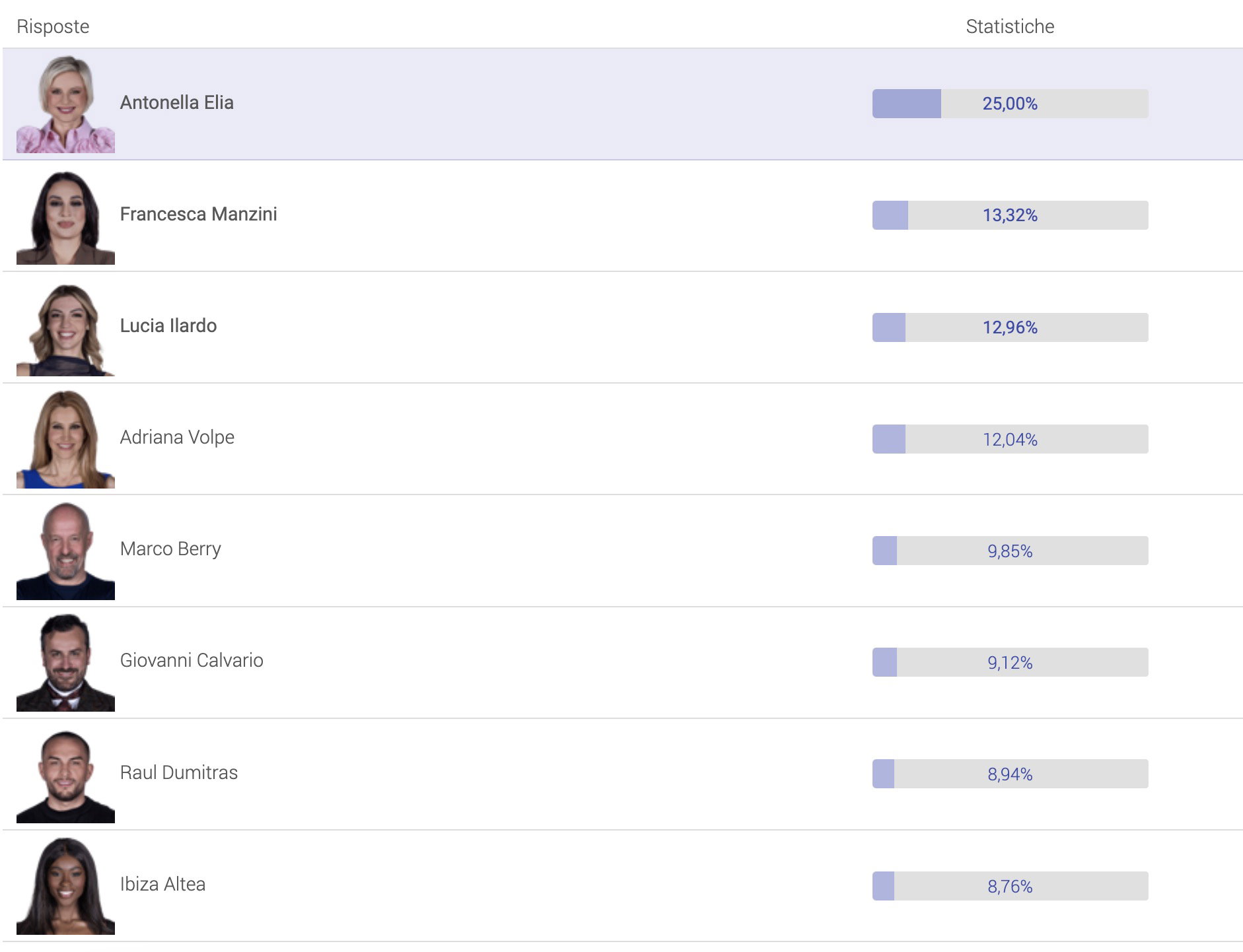 Gli otto che sono al televoto per l’eliminazione sono: Adriana Volpe, Antonella Elia, Francesca Manzini, Giovanni Calvario, Ibiza Altea, Lucia Ilardo, Marco Berry e Raul Dumitras. E anche questa volta i sondaggi sono piuttosto netti e ad avere la peggio potrebbe essere -a sorpresa- Ibiza Altea.