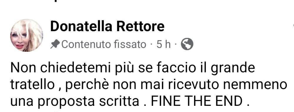 Lo stesso ha fatto Karina Cascella, sempre su Instagram: “Stavo leggendo un po’ di messaggi e devo dire che mi fa sorridere sapere che anche quest’anno, come sempre, il mio nome viene dato per certo. Onestamente, ricordate un’edizione del Grande Fratello senza il mio nome tra i presunti concorrenti? Io no. E quindi eccomi qui a dirvelo per l’ennesima volta: è una bugia. Mi viene da ridere, perché poi uno si sveglia e trova messaggi, direct, amici e parenti che chiedono se partirai davvero. La verità è semplice: sì, gli autori mi hanno chiamata, sì, ho risposto, e no, ho detto di no. L’ho fatto anche stavolta, come sempre. Eppure il mio nome continua a uscire. Ormai ci sono abituata, ma volevo ribadirlo pubblicamente ancora una volta: non vado da nessuna parte“. Donatella Rettore, invece, ha scritto: “Non chiedetemi più se faccio il Grande Fratello perché non ho mai ricevuto nemmeno una proposta scritta, fine the end“.