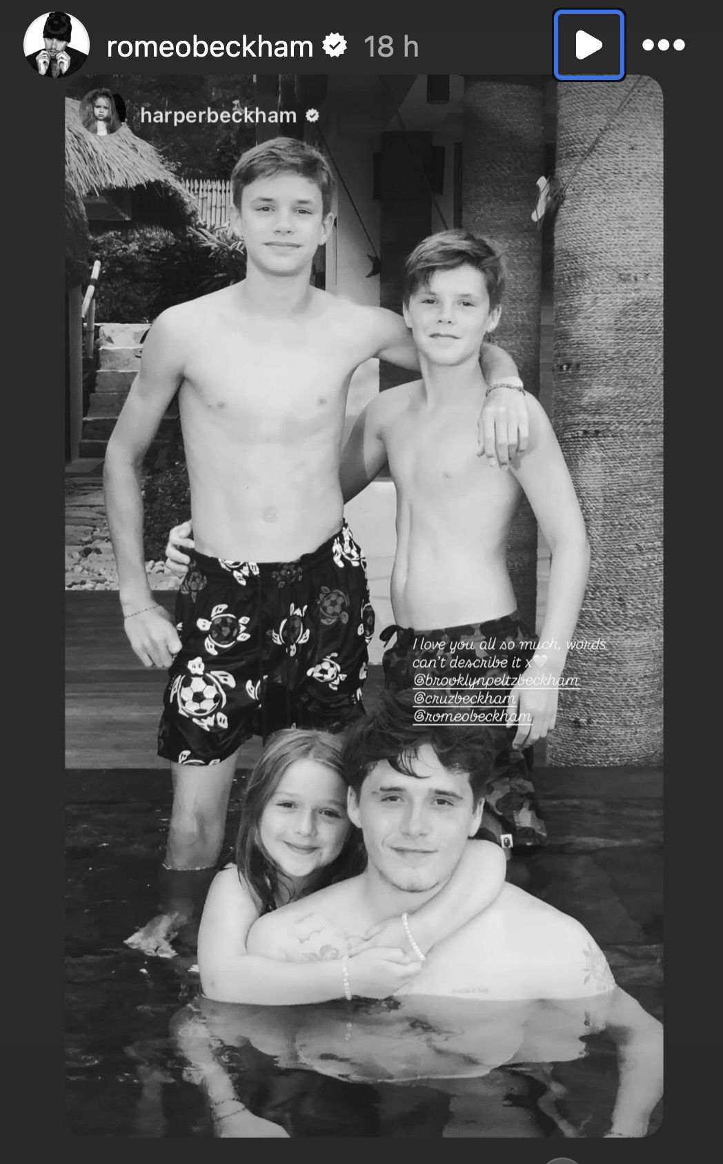 Nel giorno di San Valentino anche Harper ha tentato la riconciliazione con il fratello. La quattordicenne ha pubblicato nelle storie Instagram una foto insieme a tutti i fratelli, in cui c’è lei che abbraccia Brooklyn: “Vi amo così tanto che le parole nemmeno possono descriverlo“. Una dedica dolce, che è stata condivisa nelle ore successive da Cruz e Romeo, ma non da Brooklyn. Questo non stupisce, perché secondo i media britannici e statunitensi il primogenito di David Beckham sarebbe ancora intenzionato a non avere nessun tipo di legame con i suoi familiari.