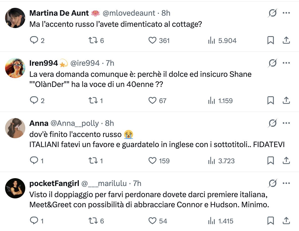 Sotto il post di HBO Max su X, un utente ha scritto: «Ma l’accento russo l’avete dimenticato al cottage?». Un altro commento si è concentrato sulla resa vocale di Shane: «La vera domanda comunque è: perché il dolce ed insicuro Shane “”OlànDer”” ha la voce di un 40enne ??». C’è poi chi ha invitato apertamente a evitare il doppiaggio italiano: «dov’è finito l’accento russo? ITALIANI fatevi un favore e guardatelo in inglese con i sottotitoli.. FIDATEVI».