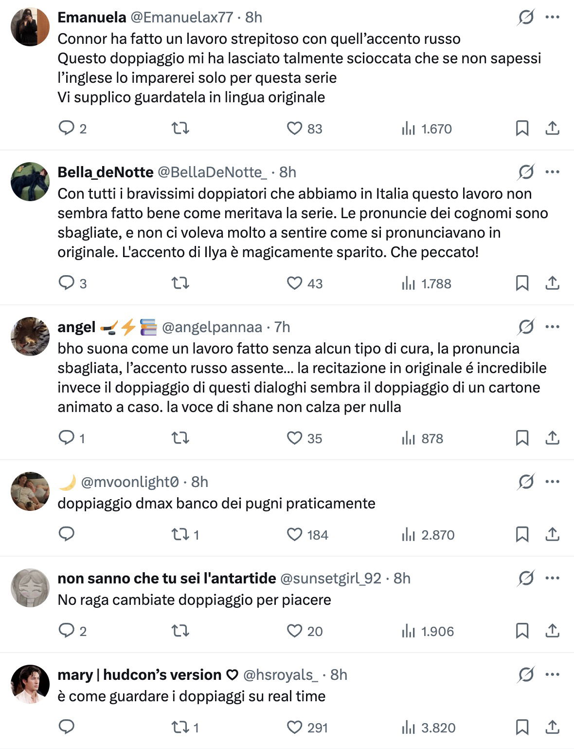 Nel confronto con la versione originale, un utente ha affermato: «Connor ha fatto un lavoro strepitoso con quell’accento russo», mentre un altro ha aggiunto: «Questo doppiaggio mi ha lasciato talmente scioccata che se non sapessi l’inglese lo imparerei solo per questa serie» e conclude con un appello diretto: «Vi supplico guardatela in lingua originale». Altri commenti evidenziano una delusione più generale: «Con tutti i bravissimi doppiatori che abbiamo in Italia questo lavoro non sembra fatto bene come meritava la serie. Le pronuncie dei cognomi sono sbagliate, e non ci voleva molto a sentire come si pronunciavano in originale. L’accento di Ilya è magicamente sparito. Che peccato!».