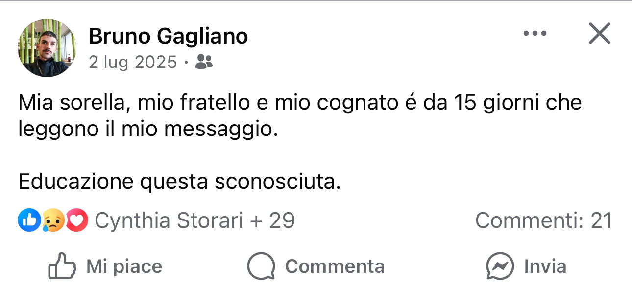 Purtroppo, nonostante l’affetto degli amici, Bruno Gagliano nella notte fra sabato 24 e domenica 25 gennaio ha deciso di farla finita gettandosi dal balcone di casa sua dove viveva al nono piano in via Apiro, zona Castel Giubileo, a Roma. Il corpo è stato trovato sul balcone del secondo piano dalla donna che viveva al piano di sopra e che si è affacciata: chiamata l’ambulanza, i soccorritori non hanno potuto far altro che constatarne il decesso.