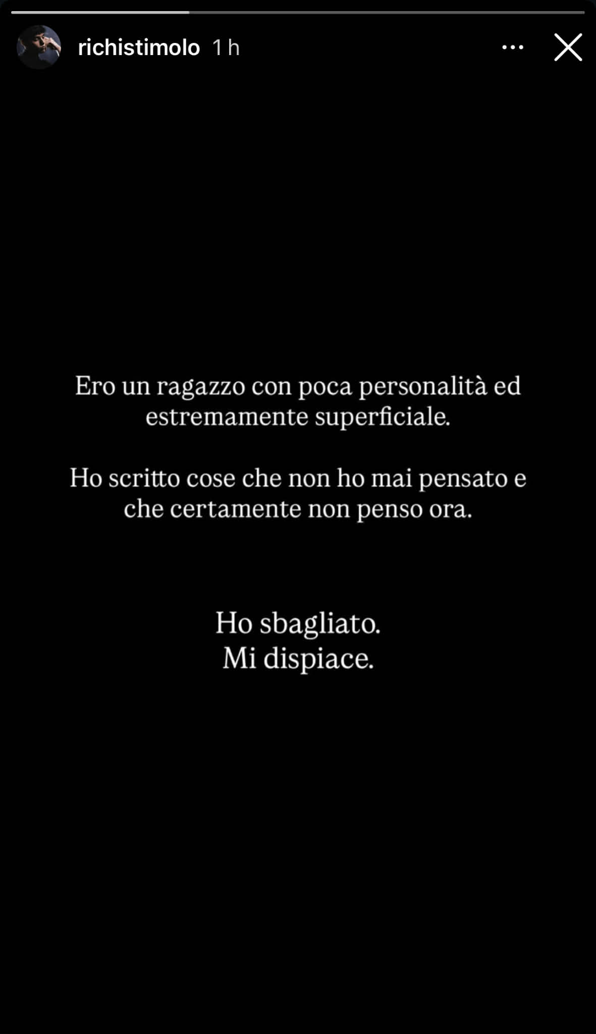 Ad ogni modo Riccardo ha ammesso di aver sbagliato e che per questo motivo gli dispiace. “Ero un ragazzo con poca personalità ed estremamente superficiale. Ho scritto cose che non ho mai pensato e che certamente non penso ora. Ho sbagliato, mi dispiace“. Scuse sincere?