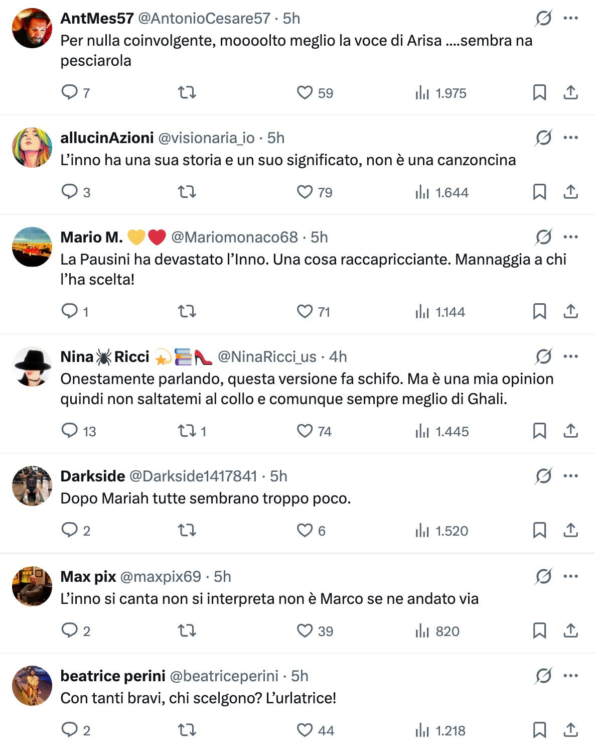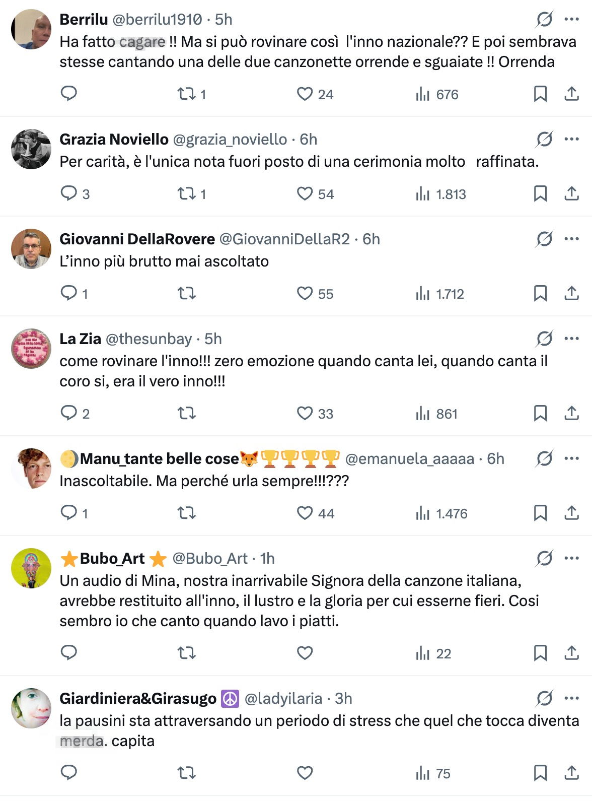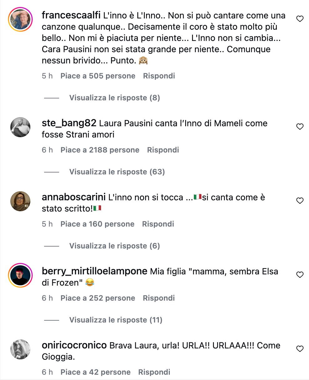 C’è anche chi ha fatto paragoni ingombranti: «Un audio di Mina, nostra inarrivabile Signora della canzone italiana, avrebbe restituito all’inno il lustro e la gloria per cui esserne fieri. Così sembro io che canto quando lavo i piatti», e chi ha liquidato tutto con una frase secca: «L’inno più brutto mai ascoltato». Diversi utenti hanno criticato lo stile interpretativo, ribadendo che l’inno non dovrebbe essere “reinterpretato”: «L’inno si canta non si interpreta», «Per favore lo ha rovinato, l’inno va cantato non interpretato», e ancora «Come rovinare l’inno!!! Zero emozione quando canta lei, quando canta il coro sì, era il vero inno!!!».