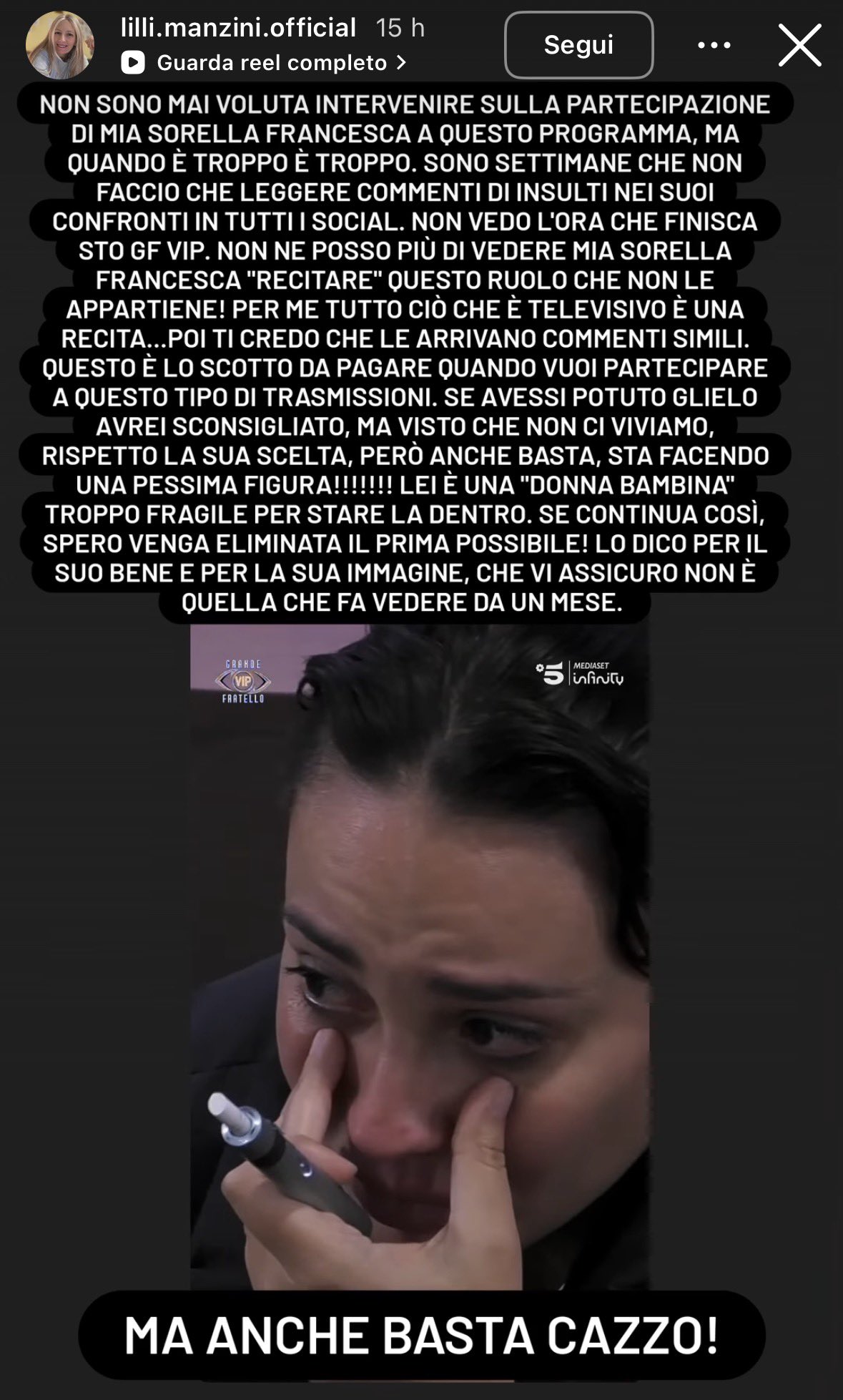 Una versione che non ha convinto sua sorella Lilli che su Instagram ha scritto: “Non sono mai voluta intervenire sulla partecipazione di mia sorella Francesca a questo programma, ma quando è troppo è troppo” – E ancora: – “Sono settimane che non faccio che leggere commenti di insulti nei suoi confronti in tutti i social. Non vedo l’ora che finisca sto GF Vip. Non ne posso più di vedere mia sorella Francesca recitare questo ruolo che non le appartiene! Per me tutto ciò che è televisivo è una recita… Poi ti credo che le arrivano commenti simili. Questo è lo scotto da pagare quando vuoi partecipare a questo tipo di trasmissioni“.