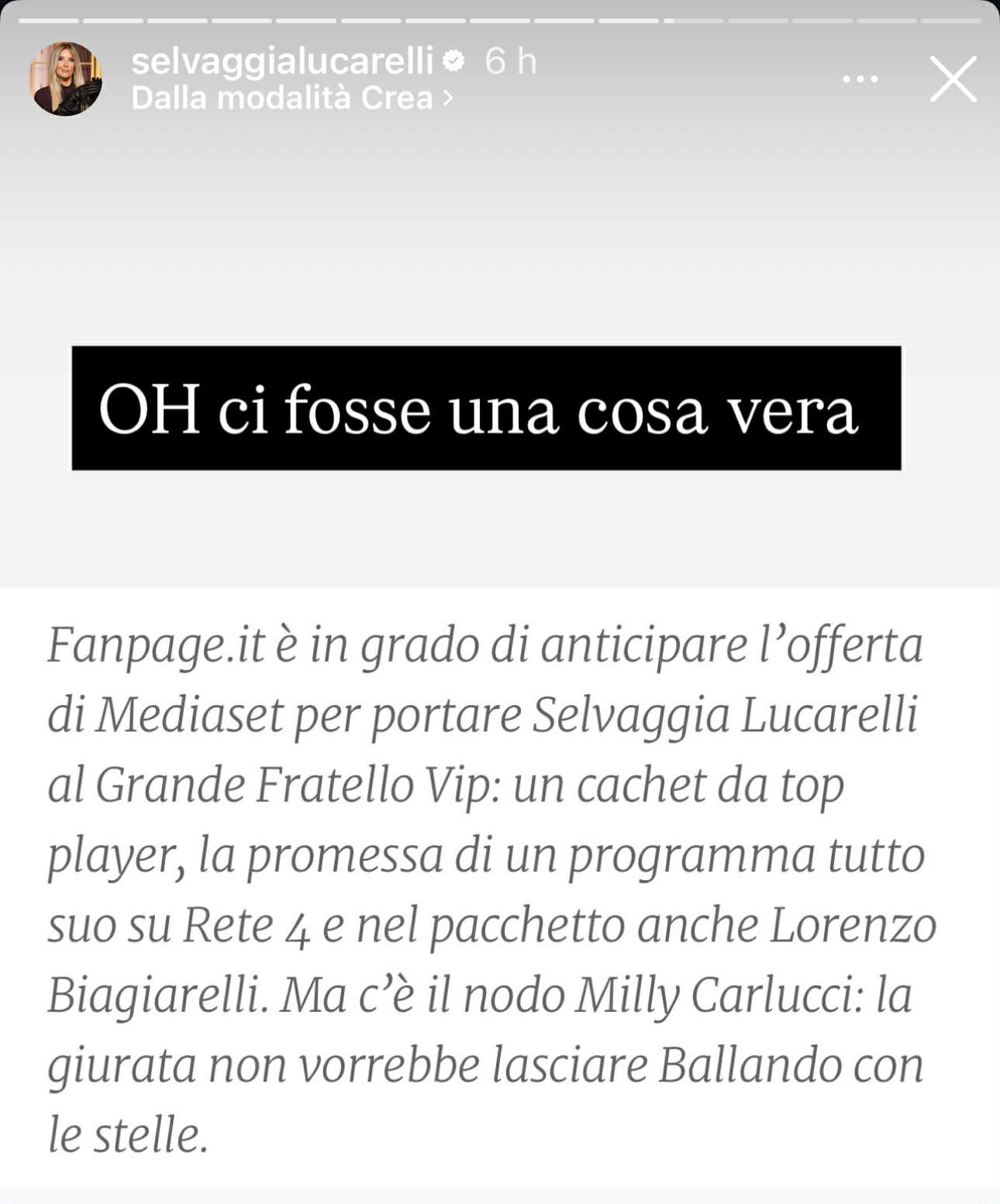 Selvaggia Lucarelli in merito a questo articolo ha prima scritto sui suoi social: “Oh ci fosse una cosa vera” e poi: “Da qualche mese ©FanPage.it pubblica notizie completamente inventate su di me a firma del solito. Forse sarebbe il caso di fare la minima verifica giornalistica anche perché va bene fare clickbait inventando contratti ormai prossimi alla firma, condizioni, cachet, ma scrivere che nell’inesistente pacchetto richiesto a un editore televisivo ci sia pure una rubrica per il mio fidanzato in qualche programma DELLA MATTINA (dove, poi???) è roba da miserabili. Non esiste alcun pacchetto di richieste e il mio fidanzato al momento preferirebbe darsi fuoco con la torcia olimpica che avere una rubrica a caso in tv. Basterebbe alzare il telefono e fare la minima verifica, ma ovviamente non si fa perché lo scopo è esattamente inventare scemenze. Detto ciò, il GF lo faccio solo se llary Blasi ci prova con me“.