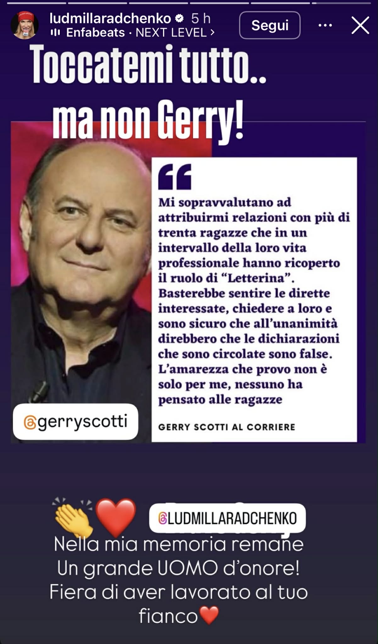 Poco dopo ha pubblicato anche un’altra storia con la smentita di Gerry Scotti scrivendo: “Toccatemi tutto ma non Gerry, nella mia memoria rimane un grande uomo d’onore, fiera di aver lavorato al suo fianco“.