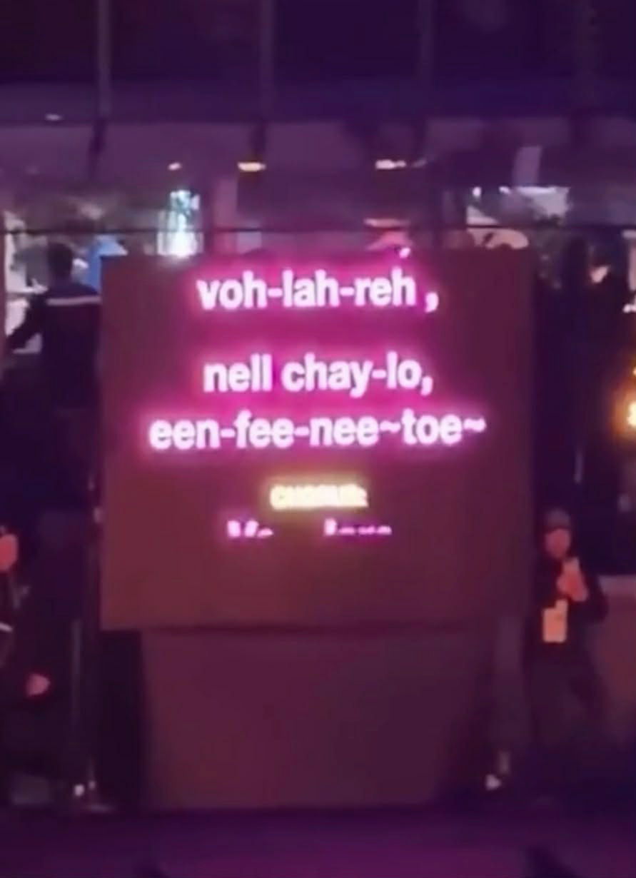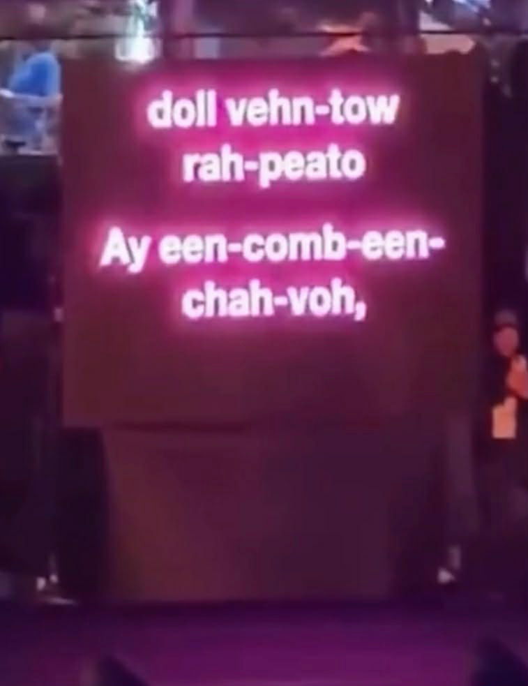 Nel maxi schermo, però, non appariva il testo in italiano, ma le parole italiane adattate foneticamente ai suoi americani: così “volare” è diventato “voh-lah-reh”, “nel cielo” si è trasformato in “nell chay-lo” e “dal vento rapito” è passato come “doll vehn-tow rah-peato”. «Il gobbo di Mariah mi devasta», ha scritto Tommaso Zorzi commentando il video, che è praticamente quello che faceva ogni venerdì sera Carmen Di Pietro a Tale e Quale Show quando le venivano scritti sul gobbo i suoni delle parole inglesi delle canzoni che cantava. Il mondo è paese.