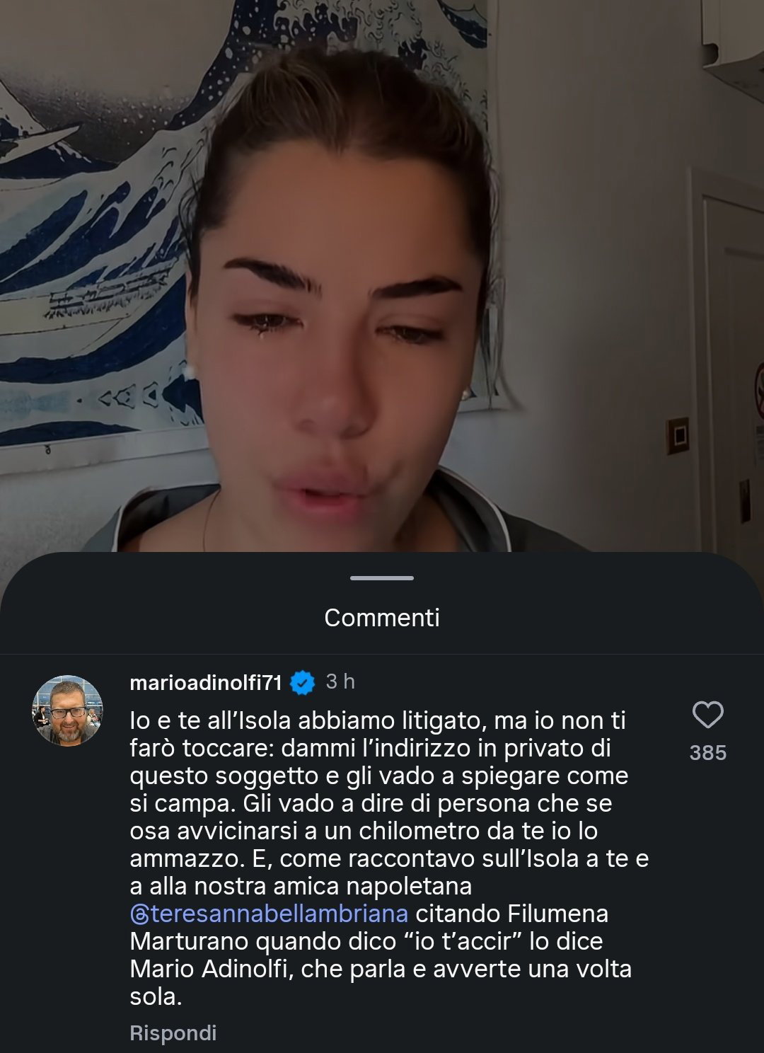 Mario Adinolfi dopo aver visto il video ha pubblicato un commento pubblico in cui ha scritto che, nonostante i contrasti avuti a L’Isola dei Famosi, si è detto pronto a difenderla, arrivando a chiedere in privato l’indirizzo del soggetto coinvolto per affrontarlo direttamente. Ha usato toni molto duri, affermando che gli avrebbe intimato di non avvicinarsi mai più e spingendosi fino a minacciare conseguenze estreme nel caso contrario. Nel suo sfogo ha anche richiamato una frase di Filumena Marturano, sottolineando di parlare “una volta sola” e di essere serio nelle sue parole.