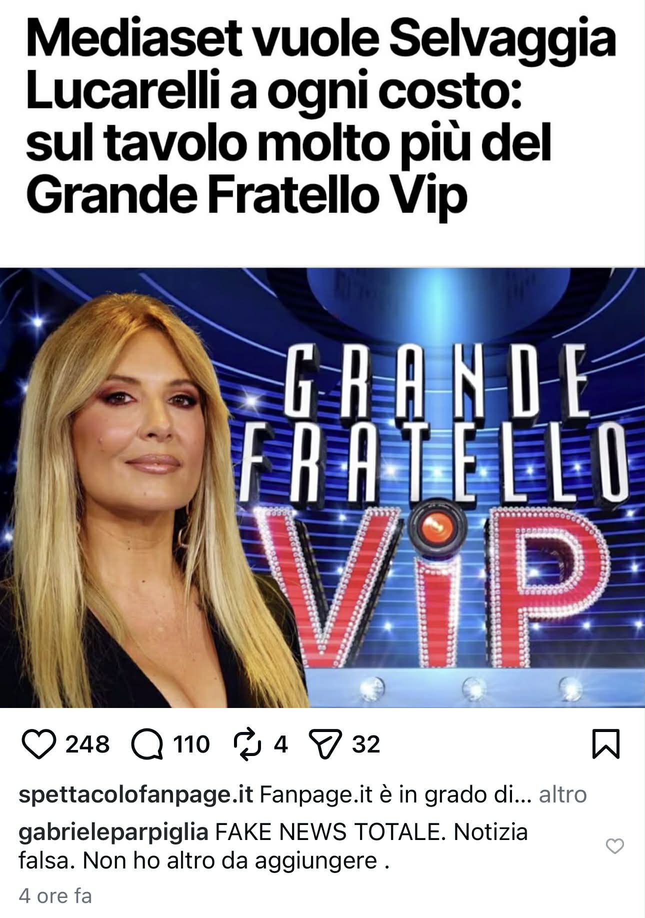 Per completezza di cronaca vi devo dire che Selvaggia Lucarelli non ha commentato la notizia, ma lo ha fatto Gabriele Parpiglia, giornalista e suo amico, che sia su Instagram che su X ha ripreso il post di FanPage dando per certo che sia una bufala. “Per mie info posso dire con certezza ASSOLUTA ripeto ASSOLUTA che questa è una FAKE NEWS TOTALE. Io boh non so come si possano scrivere articoli privi di fondamento totale. Fake news totale e andrei cauto quando si scrive sul Grande Fratello Vip“.