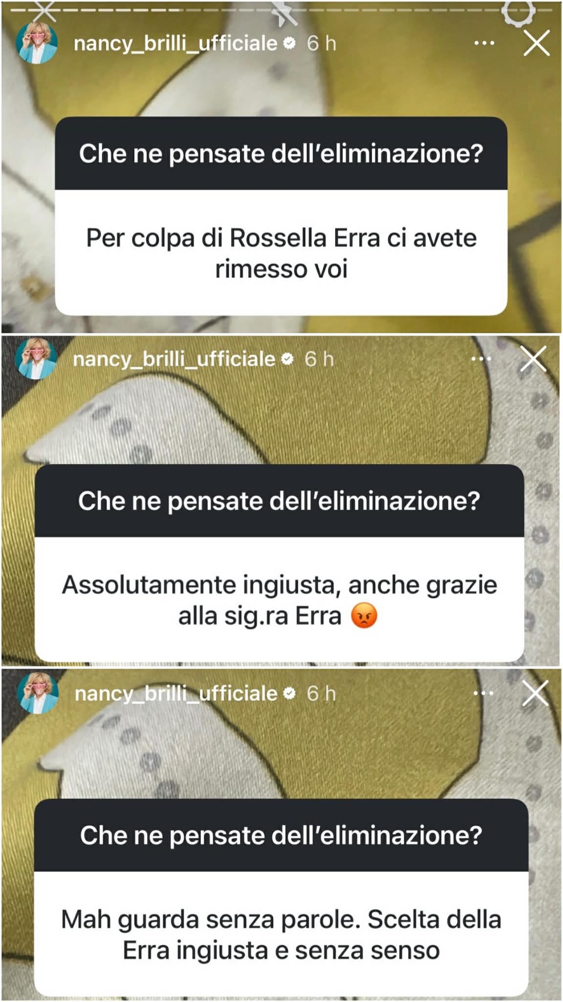 Insomma, che al primo giro rientrasse Francesca Fialdini era cosa scontata e nota a tutti, la vera sfida ci sarebbe stata fra Paolo Belli e Nancy Brilli: una sfida mai vista perché il tesoretto ha stravolto tutto e ha permesso al cantante di vincere facile sulla signora Coriandoli. Una scelta che Rossella Erra ha preso di strategia, come confessato in tv: “Quando ci sono i voti social e i voti della giuria io mi faccio i miei calcoli e questo è il risultato. Poi vedrai“. Nancy Brilli, pubblicamente, non ha commentato l’accaduto, limitandosi a condividere sui social alcune delle risposte dei suoi fan alla domanda che aveva posto: “Che ne pensate della mia eliminazione?“.