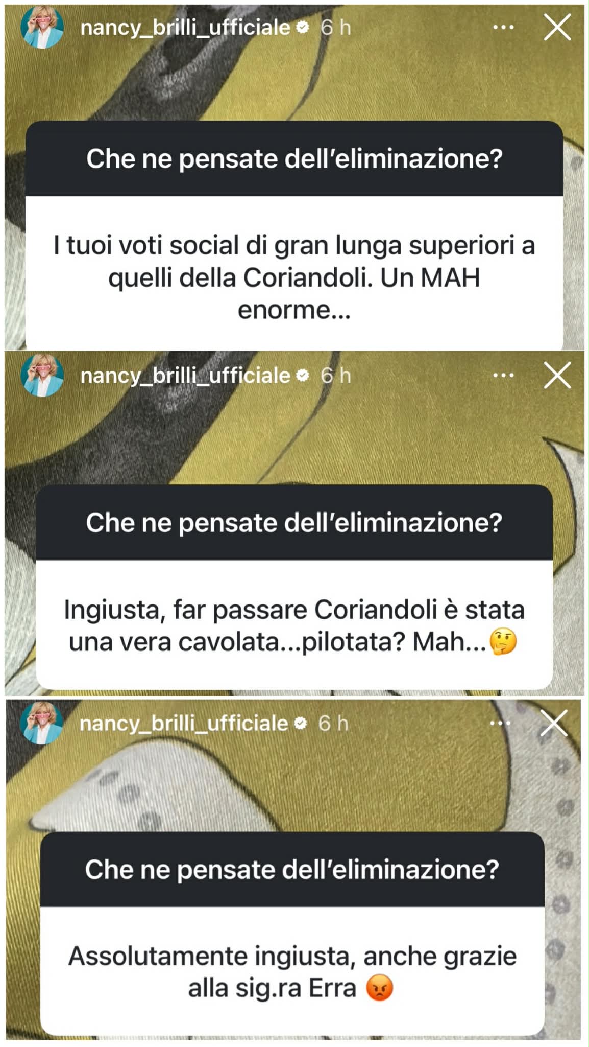 Questi alcuni commenti che l’attrice ha condiviso: “I tuoi voti social di gran lunga superiori a quelli della Coriandoli, un mah enorme“; “Ingiusta far passare Coriandoli, è stata una cavolata. Pilotata? Mah!“; “Assolutamente ingiusta, anche grazie alla signora Erra“; “Per colpa di Rossella Erra ci avete rimesso voi”; “Assolutamente ingiusta“; “Ma guarda, senza parole, scelta della Erra ingiusta e senza senso“. Insomma, anche senza dire niente, è chiara la sua posizione. Paolo Belli, che sulla pista da ballo non brilla particolarmente e che nella puntata di ieri ha ottenuto gli stessi voti di Nancy Brilli, è riuscito a passare alla puntata successiva grazie a una sfida diretta con Emma Coriandoli. Ma se si fosse trovato a sfidare Nancy Brilli, la situazione sarebbe stata diversa?