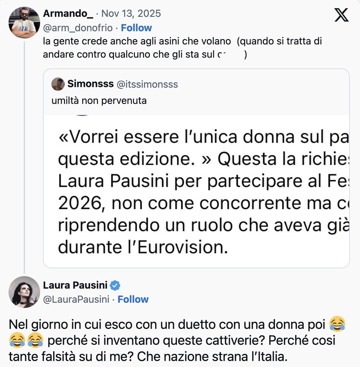 I fan di Laura non hanno creduto a questa indiscrezione e un utente su X ha scritto: “Ma davvero pensate che sia vero? La gente crede anche agli asini che volano (quando si tratta di andare contro qualcuno che gli sta antipatico)“.