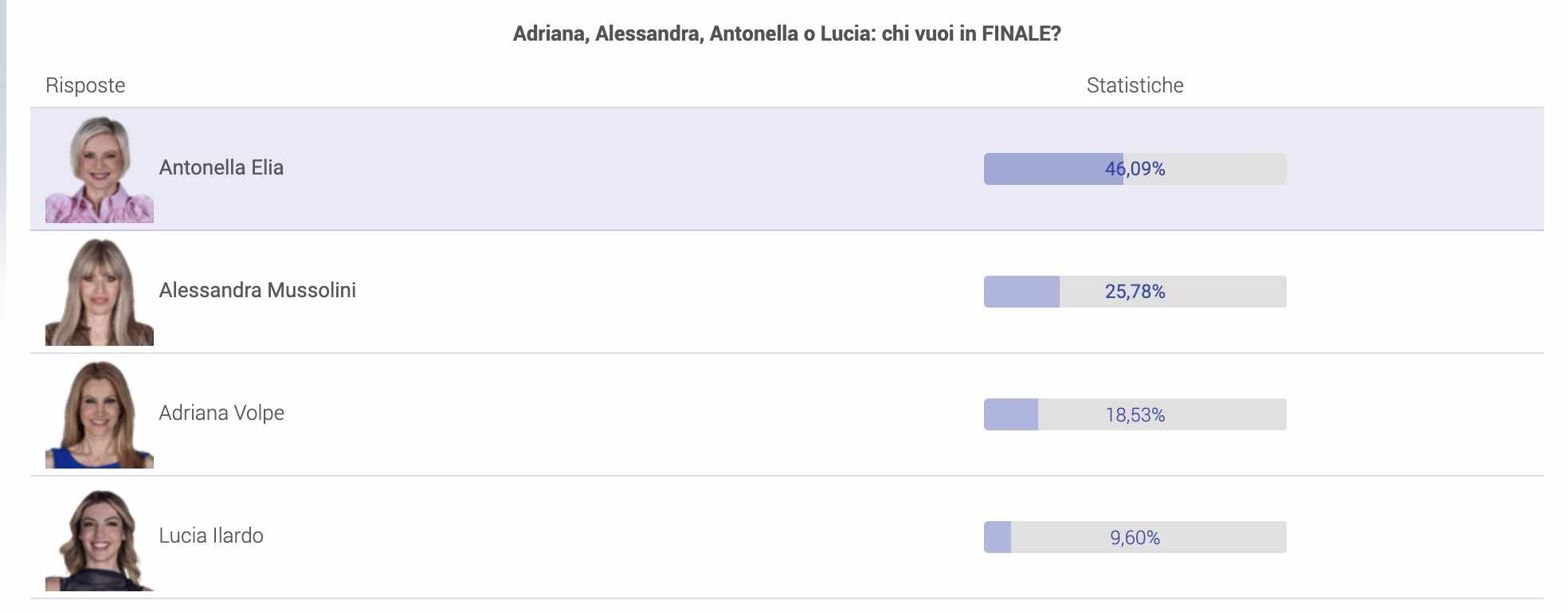 Prima finalista del Grande Fratello Vip tra Adriana, Alessandra, Antonella e Lucia: i risultati dei sondaggi