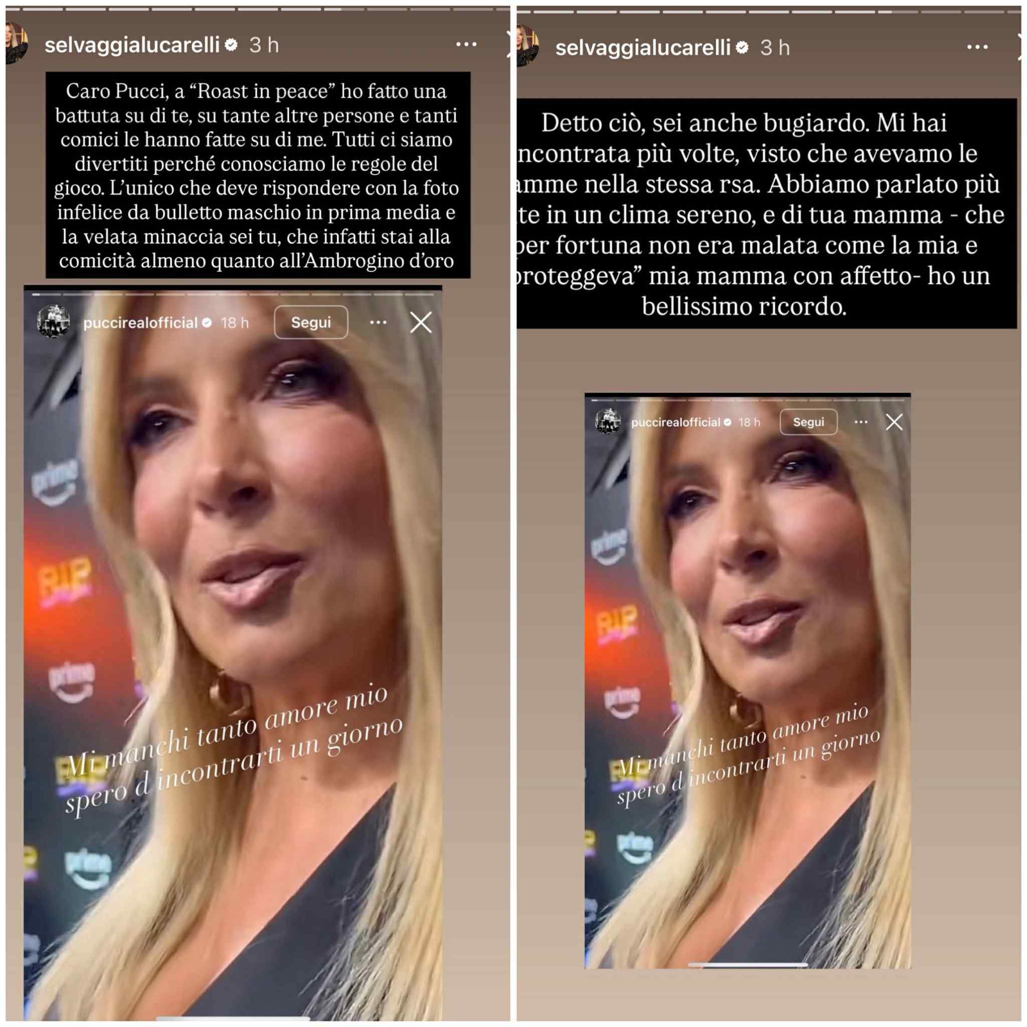 “Caro Pucci, a Roast In Peace ho fatto una battuta su di te, su tante altre persone e tanti comici le hanno fatte su di me” – ha scritto Selvaggia Lucarelli – “Tutti ci siamo divertiti perché conosciamo le regole del gioco. L’unico che deve rispondere con la foto infelice da bulletto maschio in prima media e la velata minaccia sei tu, che infatti stai alla comicità almeno quanto all’Ambrogino d’oro. Detto ciò, sei anche bugiardo. Mi hai incontrata più volte, visto che avevamo le mamme nella stessa rsa. Abbiamo parlato più volte in un clima sereno, e di tua mamma – che per fortuna non era malata come la mia e “proteggeva” mia mamma con affetto- ho un bellissimo ricordo“.
