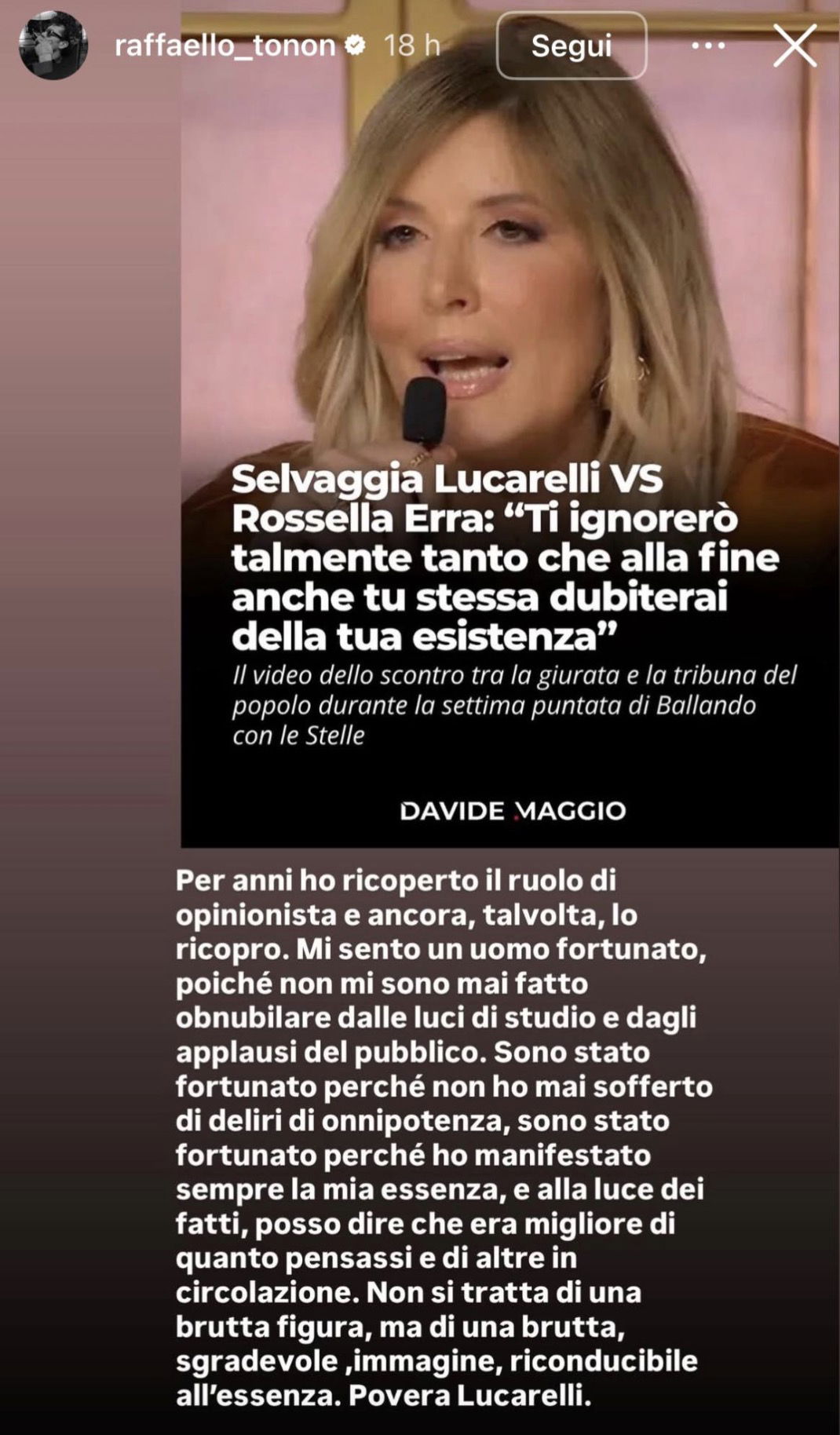 Raffaello Tonon ha condiviso un articolo di Davide Maggio dedicato alla stilettata che la Lucarelli ha rivolto a Rossella Erra e ha espresso il suo pensiero sulle parole della giurata di Ballando Con le Stelle. L’opinionista ha duramente criticato Selvaggia e c’è andato già piuttosto pesante: “Per anni ho ricoperto il ruolo di opinionista in televisione e ancora, talvolta, lo ricopro. Mi sento un uomo fortunato, poiché non mi sono mai fatto obnubilare dalle luci di studio e dagli applausi del pubblico. Sono stato fortunato perché non ho mai sofferto di deliri di onnipotenza, sono stato fortunato perché ho manifestato sempre la mia essenza, e alla luce dei fatti, posso dire che era migliore di quanto pensassi e di altre in circolazione. Non si tratta di una brutta figura, ma di una brutta, sgradevole, immagine, riconducibile all’essenza. Povera Lucarelli“.