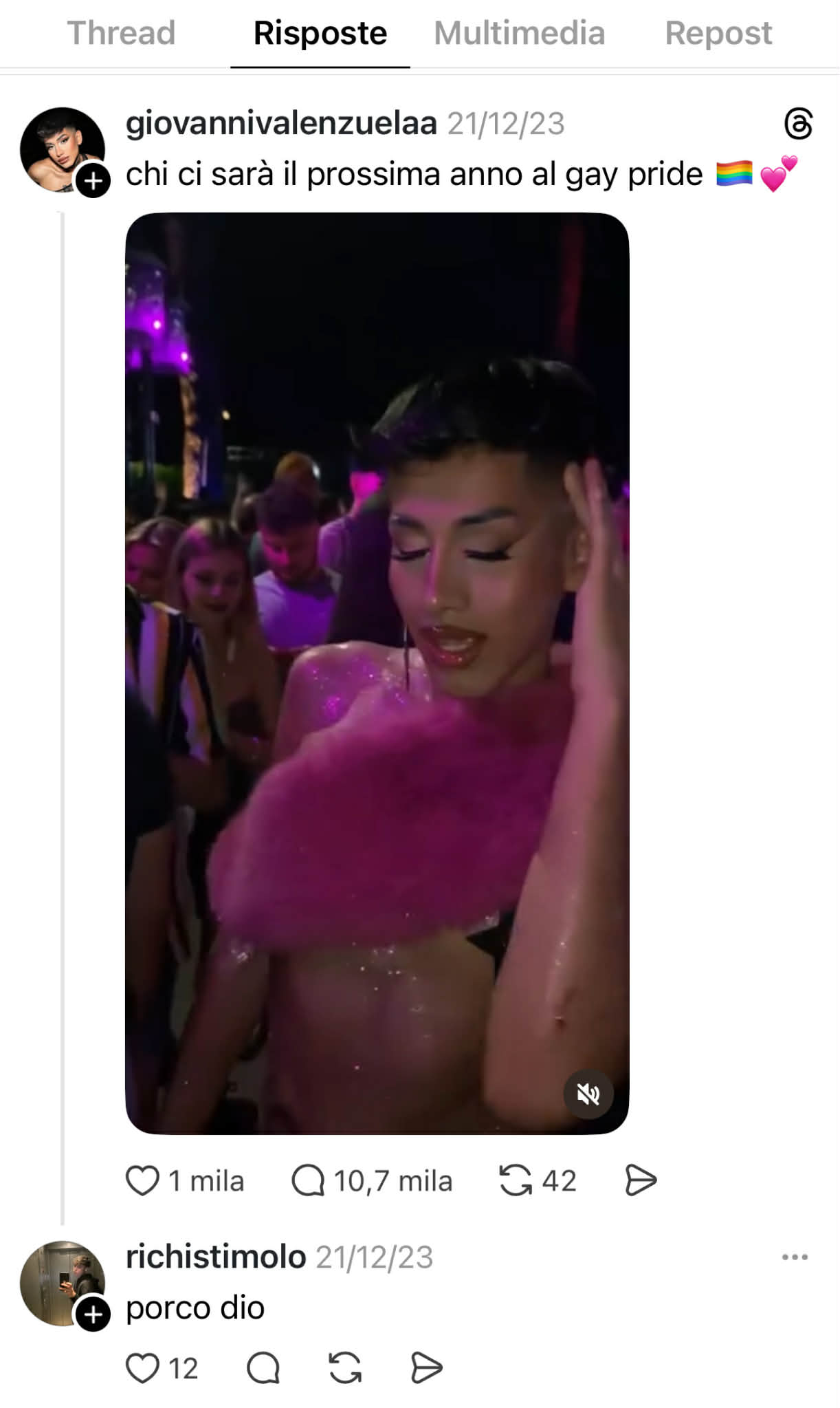 Giovanni, come già scritto, non ha mai fatto il nome dell’allievo di Amici, ma sotto al video di TikTok ha messo ‘mi piace’ a tutti i commenti che indicavano Riccardo Stimolo come autore del gesto. Ed è bastato scorrere rapidamente sul profilo Threads incriminato per risalire al post del Pride del 2023 e trovare proprio quel commento, pubblico, visibile a tutti.