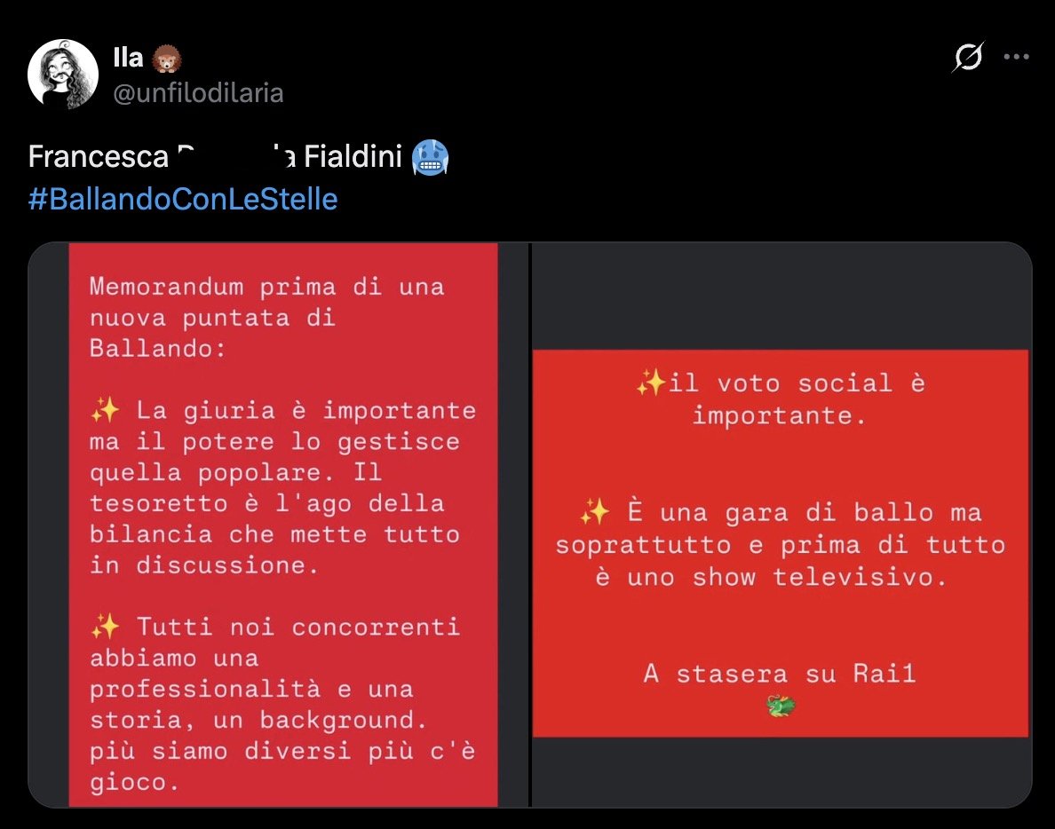 La conduttrice di Da Noi a Ruota Libera poco fa ha pubblicato due storie in cui fa delle precisazioni su Ballando Con le Stelle: “Memorandum prima di una nuova puntata di Ballando: La giuria è importante, ma il potere lo gestisce quella popolare, il tesoretto è l’ago della bilancia che mette tutto in discussione. Tutti noi concorrenti abbiamo una professionalità e una storia, un background più siamo diversi più c’è gioco. Il voto social è importante. È una gara di ballo ma soprattutto e prima di tutto è uno show televisivo. A stasera su Rai1“.