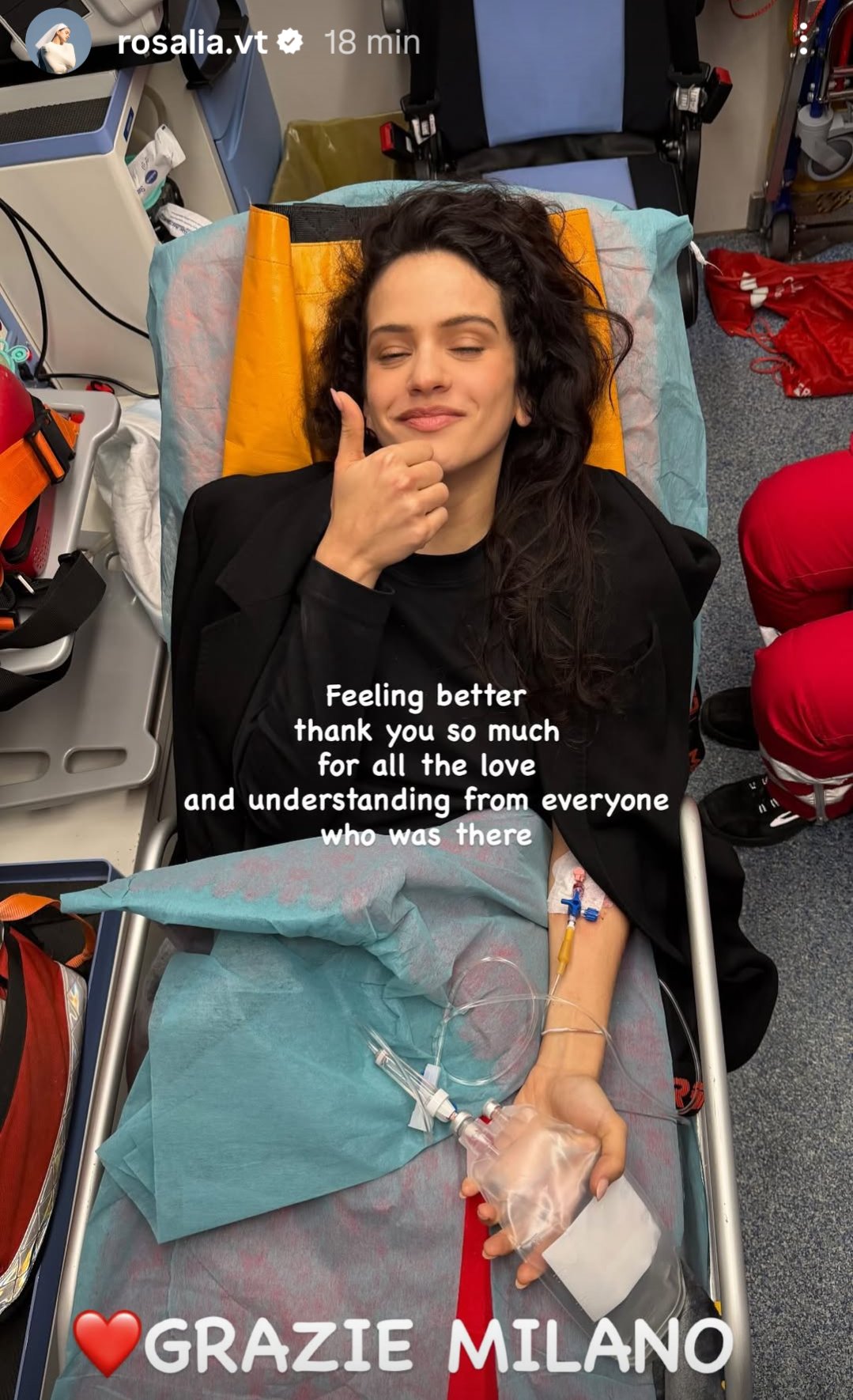 Il malessere di Rosalia era così serio, che pochi minuti dopo l’annuncio dello stop forzato, è stata portata via in ambulanza e sui social circolano anche dei video di quegli attimi. Oggi la 33enne ha pubblicato su Instagram una foto scattata in ambulanza e ha tranquillizzato i suoi fan, rivelando di stare meglio: “Mi sento meglio. Grazie mille per tutto l’amore e la comprensione di tutti coloro che erano lì. Grazie Milano“.