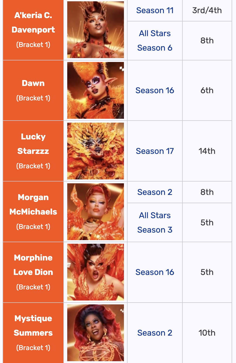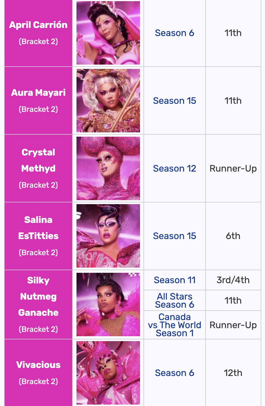 Nel dettaglio, sono state scelte: due regine dalla Season 2; due dalla Season 6; una dalla Season 7; tre dalla Season 11; una dalla Season 12; una dalla Season 13; una dalla Season 14; due dalla Season 15; tre dalla Season 16 e due dalla Season 17.